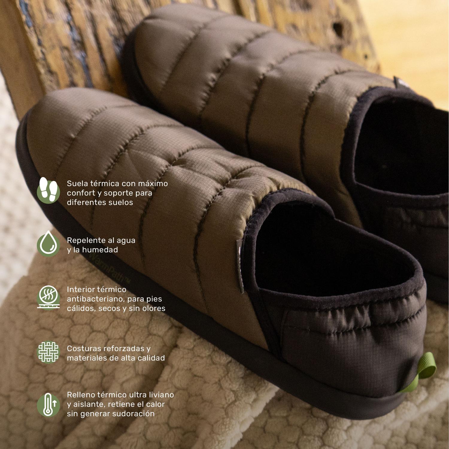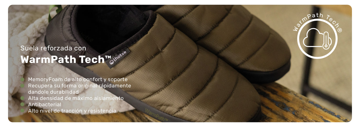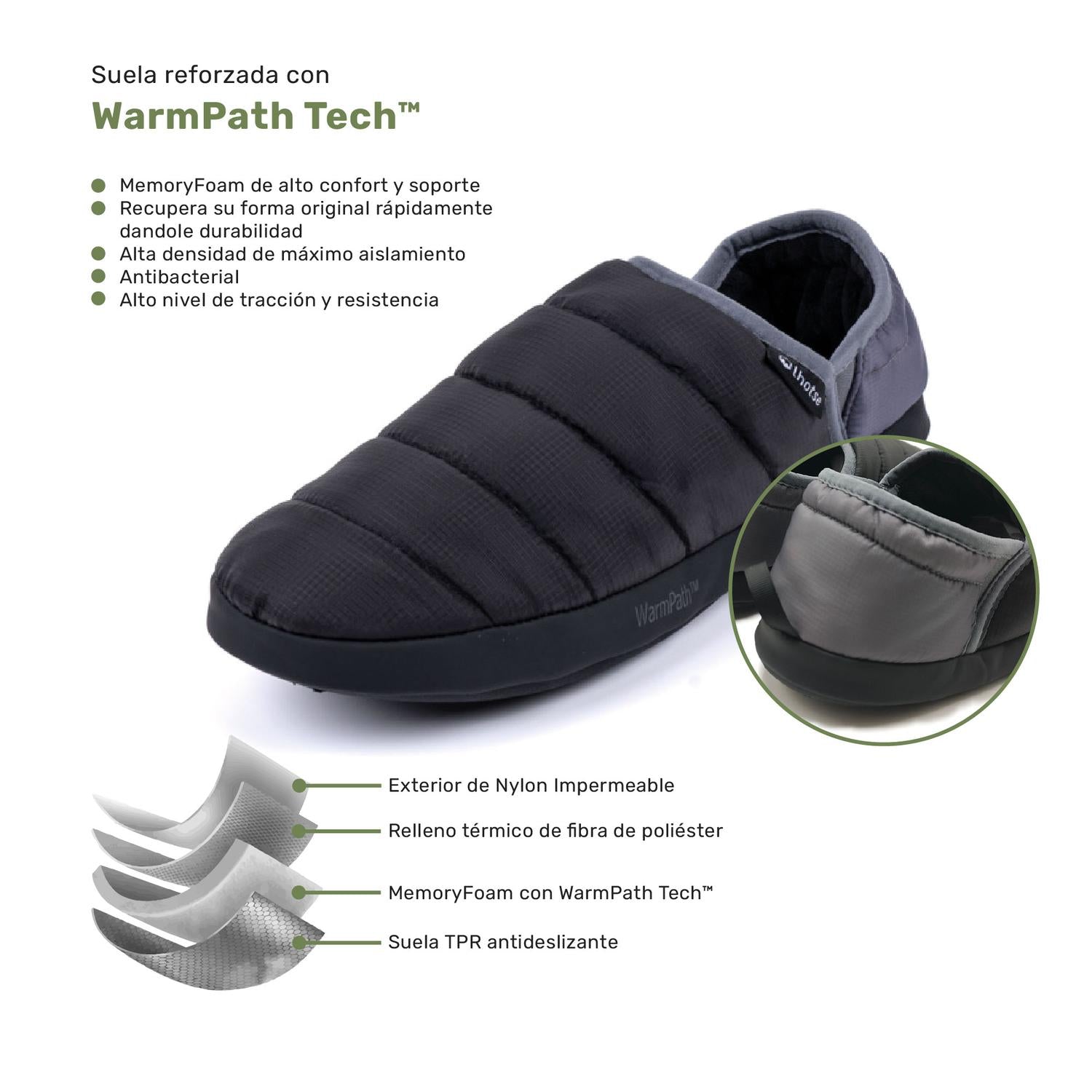 Cada paso se transforma en una caricia gracias a su suela reforzada con tecnología Warmpath, que entrega soporte anatómico y una pisada suave y firme. El exterior de nylon impermeable actúa como un escudo contra la humedad, mientras que su interior de suave micropolar térmico y antibacteriano mantiene tus pies cálidos y frescos, evitando la aparición de malos olores.