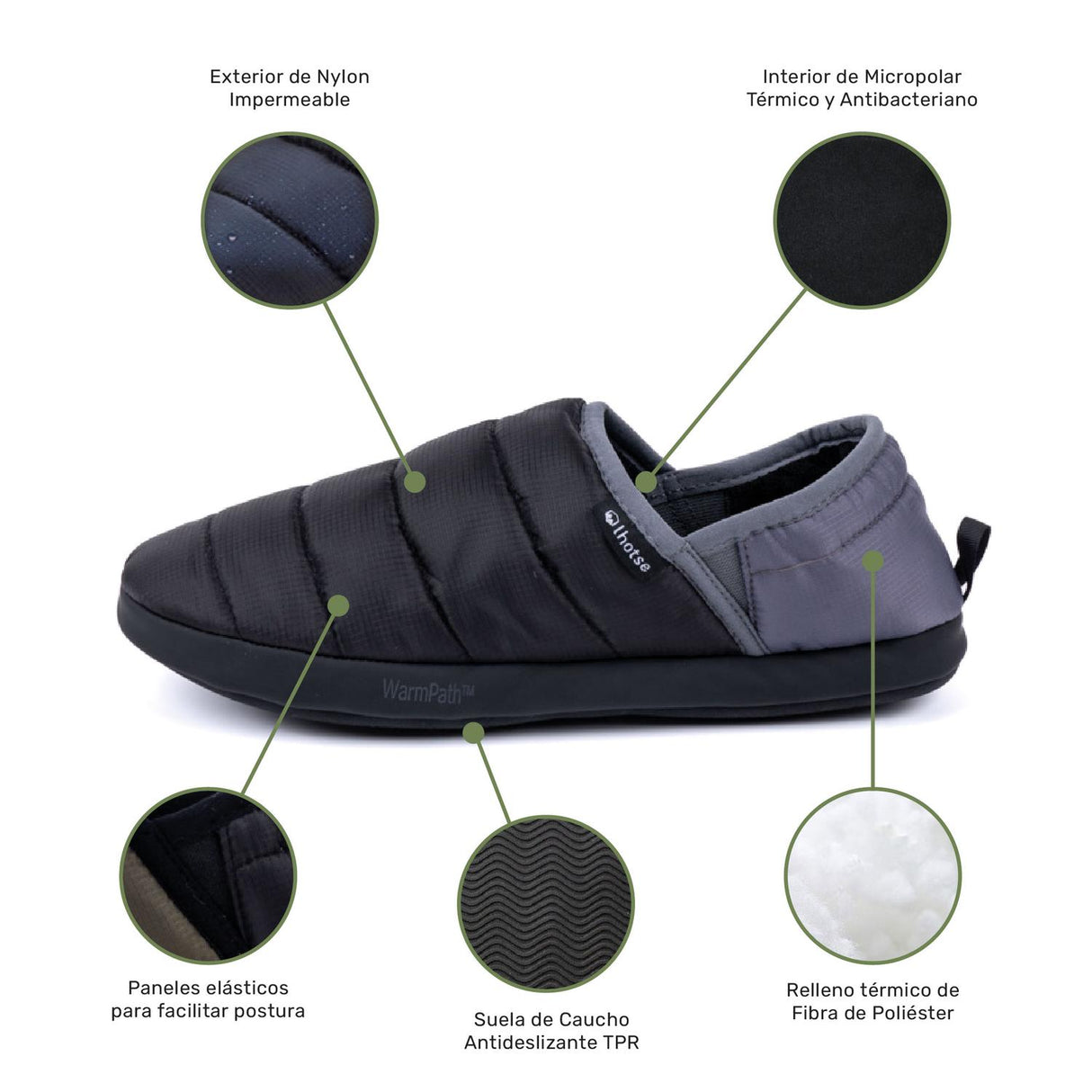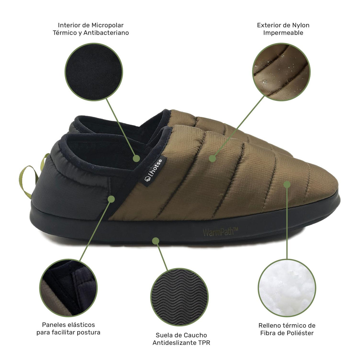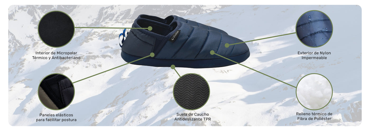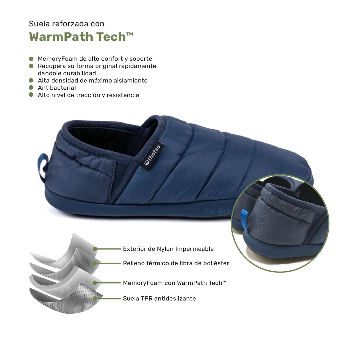 Cada paso se transforma en una caricia gracias a su suela reforzada con tecnología Warmpath, que entrega soporte anatómico y una pisada suave y firme. El exterior de nylon impermeable actúa como un escudo contra la humedad, mientras que su interior de suave micropolar térmico y antibacteriano mantiene tus pies cálidos y frescos, evitando la aparición de malos olores.