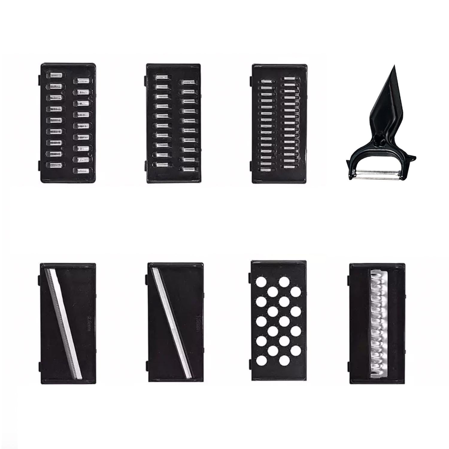 • Incluye: rallador 3mm, rallador 2mm, rebanador, rebanador ondulado, pelador, moledor, caja herramientas de corte, colador, bowl y mango de protección.