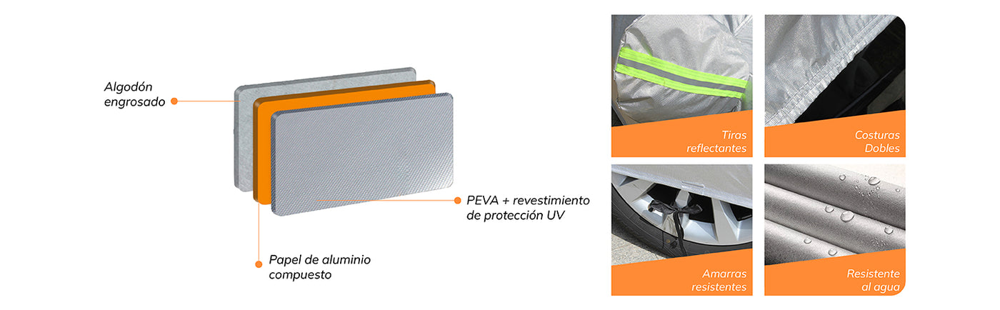 El material exterior resiste el calor extremo y cuenta con protección UV para aumentar la vida útil de la pintura de tu vehículo.