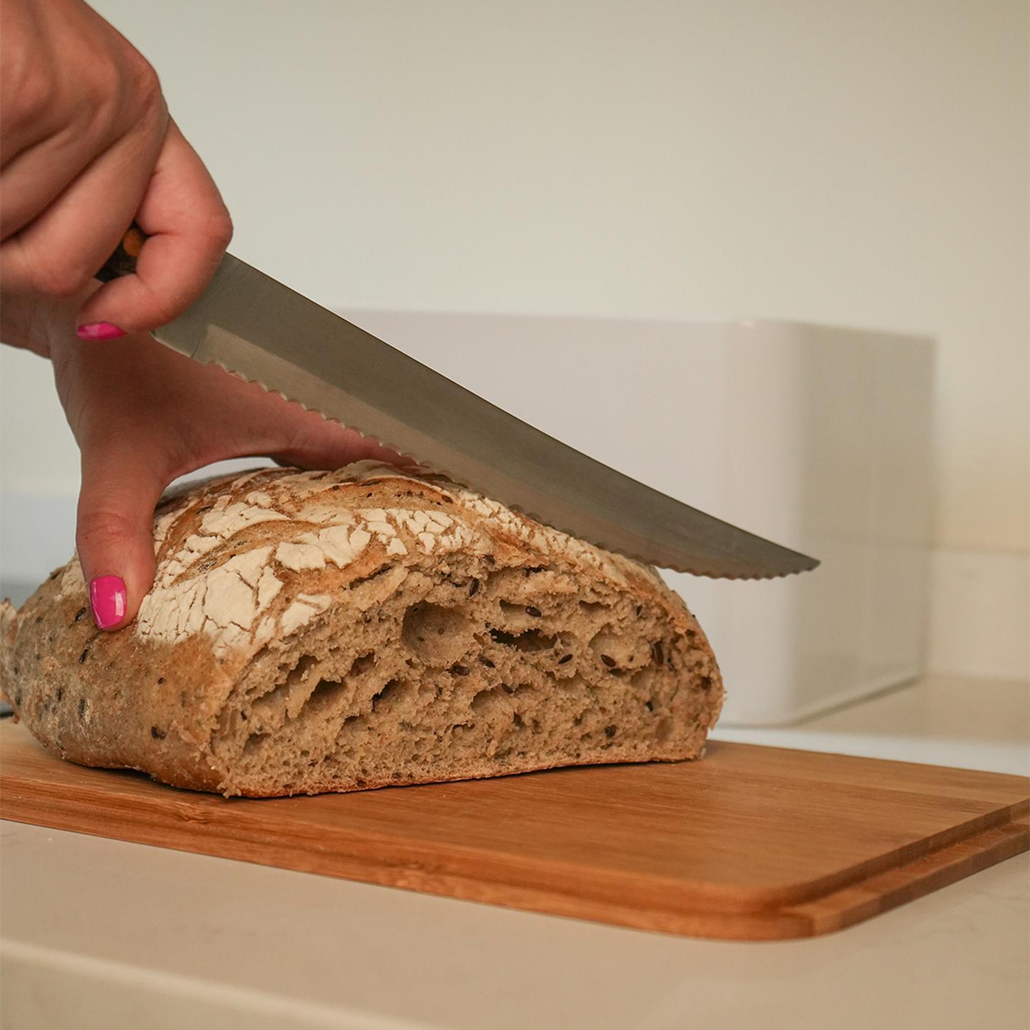 La tapa de bamboo la puedes usar como tabla para rebanar el pan o preparar lo que quieras.