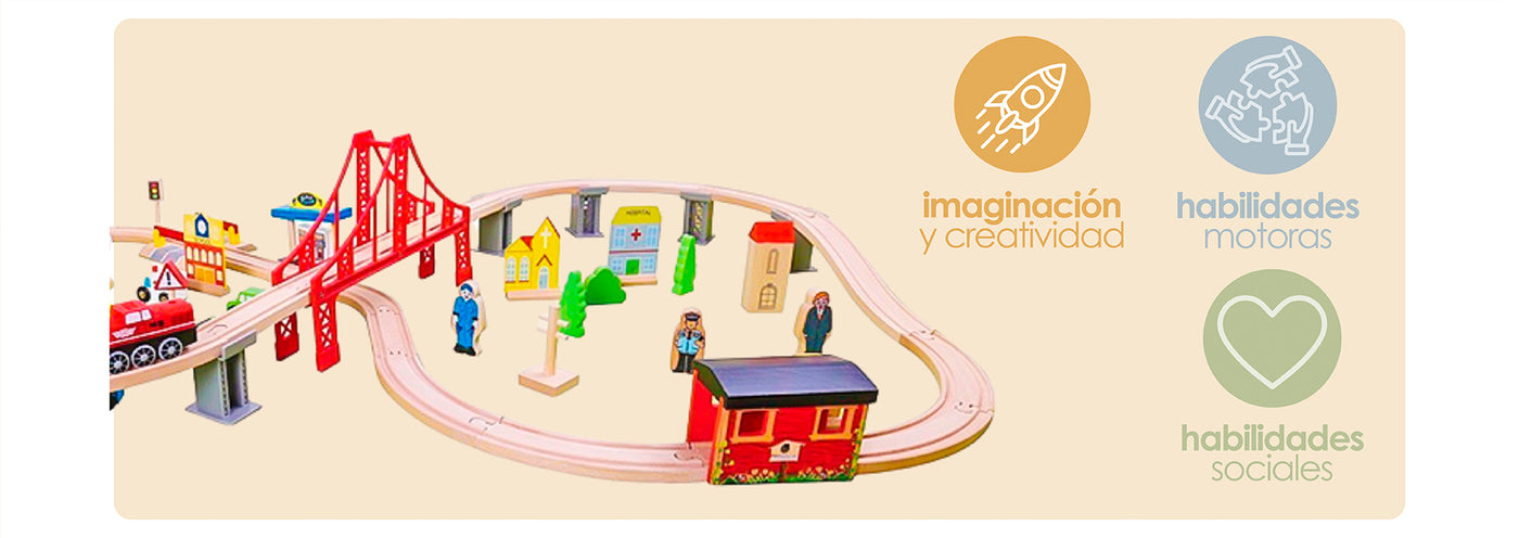 La Pista de Autos y Tren de Madera Bandú de 70 piezas es un completo set de juego que permite construir, explorar y crear historias en un mundo de trenes, autos y edificios. Ideal para desarrollar habilidades cognitivas, motrices y sociales mientras se juega de forma libre y creativa.