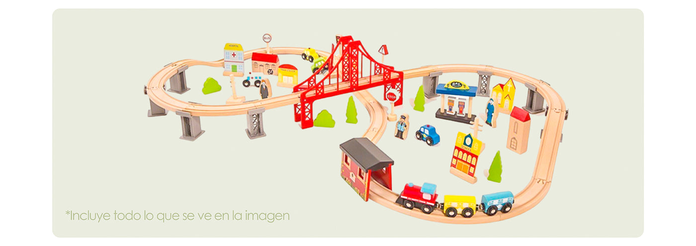 Contiene 70 piezas: rieles de madera, autos, trenes, figuras humanas, árboles, puentes, edificios y señaléticas.