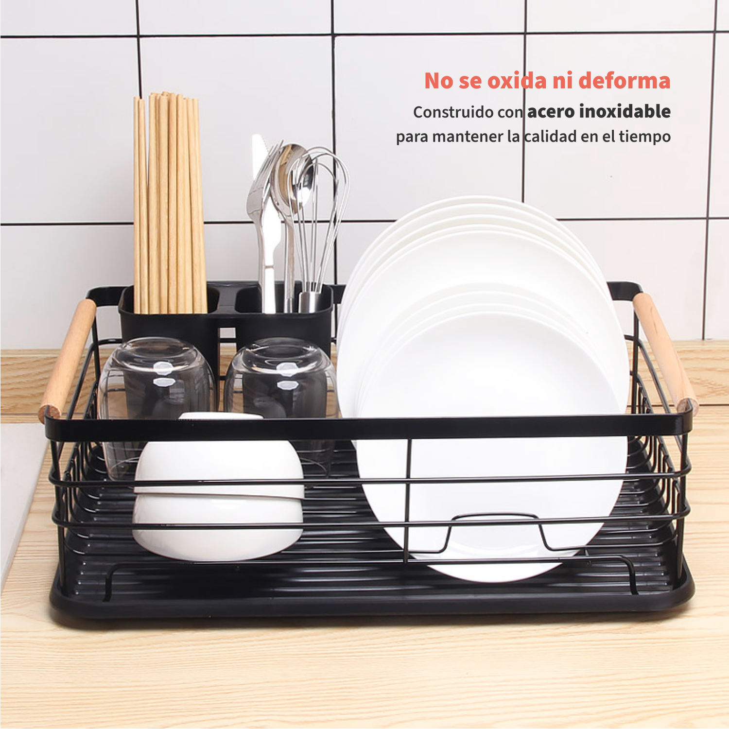 Cuenta con una bandeja inferior de drenaje y un contenedor doble para separar tus cubiertos.