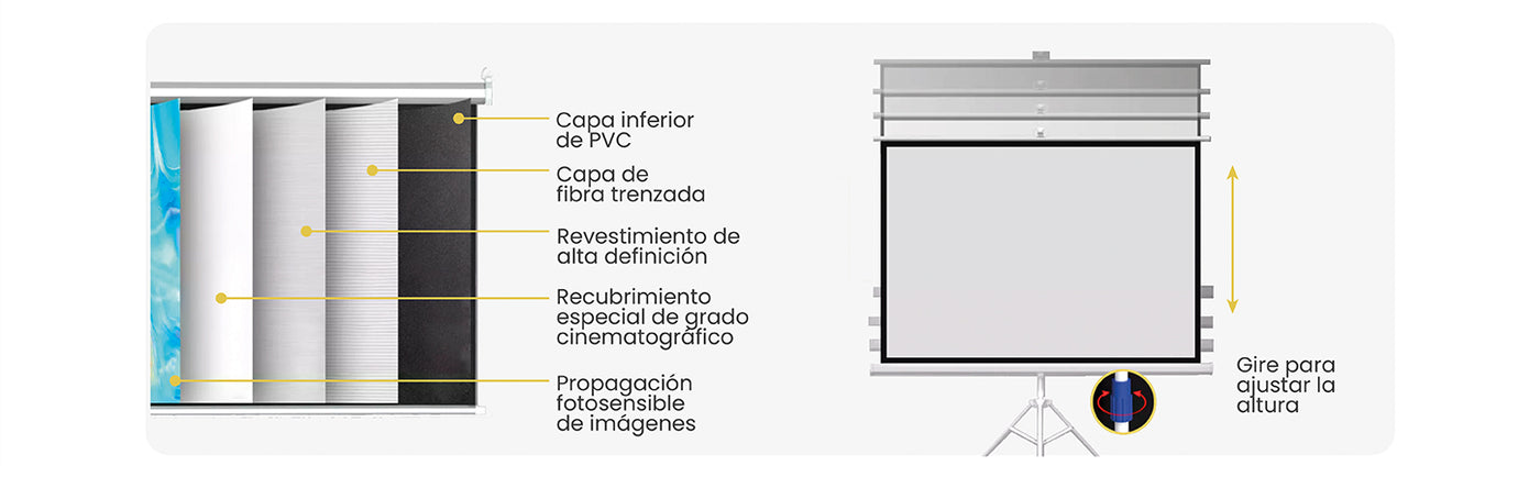 • La tela de los proyectores tiene una base de PVC y fibra de vidrio que permiten darle resistencia a las arrugas y mantienen la tela frontal sin arrugas.