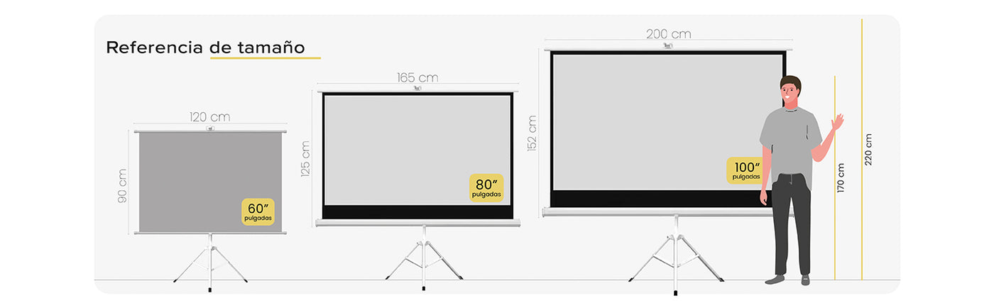 Telón mural de proyector con trípode de 60 pulgadas perfecto para todo tipo de actividades. Tardes de cine en casa, para presentaciones en la oficina, para hacer clases o para tus paseos al exterior.