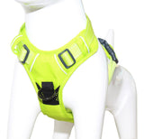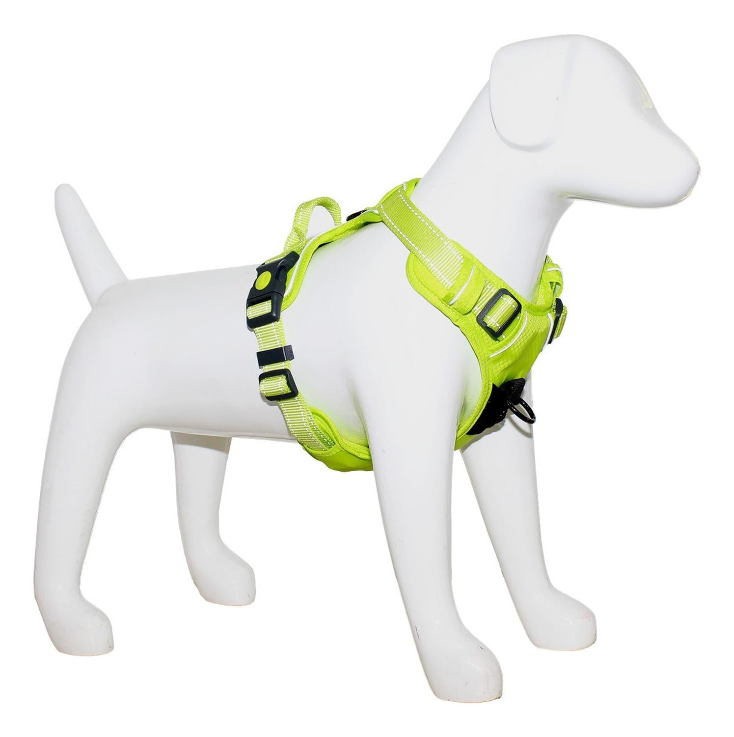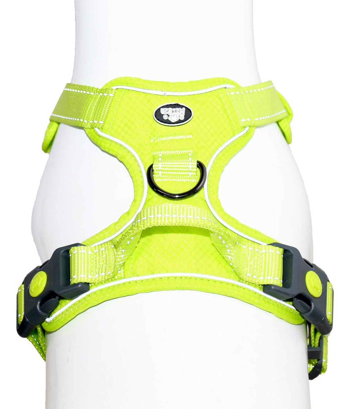 Arnés con diseño deportivo, cómodo y original. Fabricado en nylon transpirable y en divertidos colores. Disponible en varios colores y tallas. Con argolla metálica en la espalda para enganchar la correa