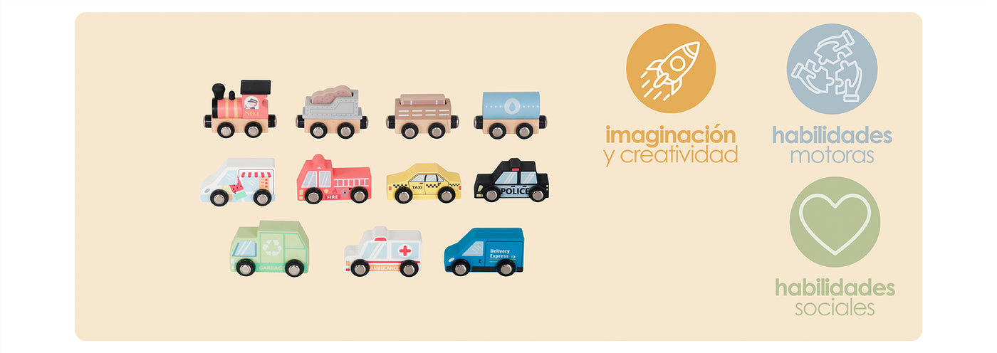 Set Autos de Juguete Tren Pista y Señaleticas Madera Bandú