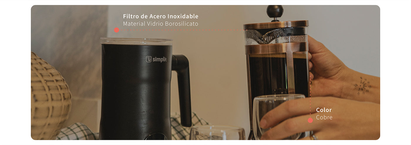 Comienza tus mañanas con la exquisita cafetera francesa Simplit de 600ml, diseñada para los verdaderos amantes del café. Esta joya combina la robustez del vidrio borosilicato, capaz de resistir altas temperaturas, con el encanto del acero inoxidable en un deslumbrante tono cobre. No solo te brinda un café excepcional gracias a su completo sistema de filtrado, sino que también se convierte en el centro de atención en cualquier mesa. Equipada con todo lo necesario para una experiencia de café inolvidable, desde el embudo hasta la malla filtrante, cada detalle está cuidadosamente pensado para deleitar tus sentidos.