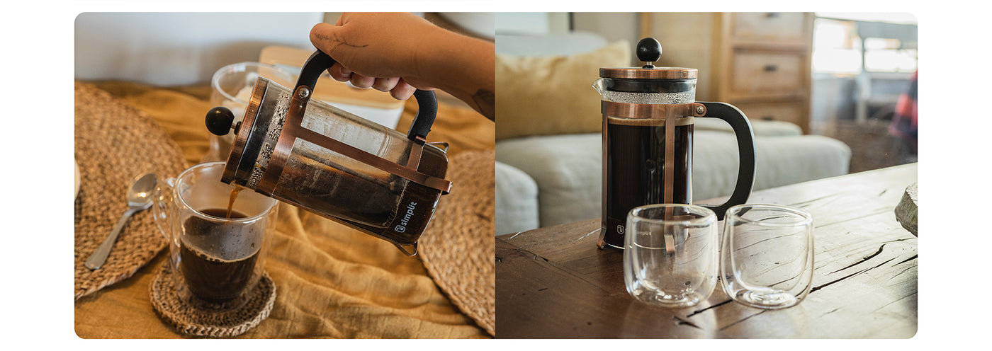¡Eleva tus momentos de café a un nivel de elegancia insuperable con el Pack Cafetera Prensa Francesa y el Set 2 Tazas de Vidrio 350ml Simplit!