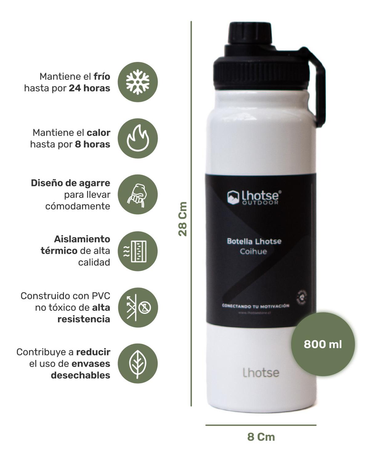Botella térmica Coihue es perfecta para acompañarte en tu día a día, en tus viajes y aventuras. Gracias a su aislamiento de doble pared mantiene el agua fría por hasta 24 horas y el agua caliente por hasta 8 horas.