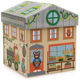 La caja de cartón se transforma en una tienda, incluye 1 auto con tráiler y 1 perro y familia de osos de 3 pcs de madera. Juego que incentiva la imaginación y el juego de rol, desarrollan el pensamiento lúdico, la creatividad. Caja hecha de cartón y accesorios de madera.