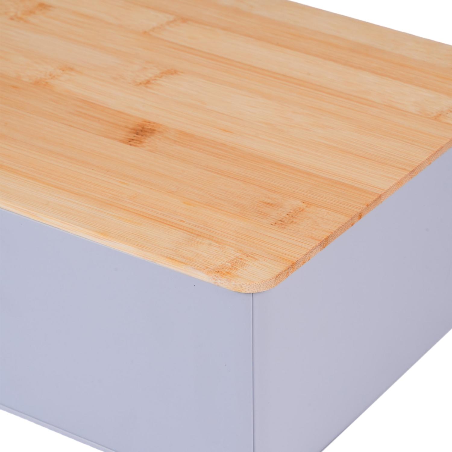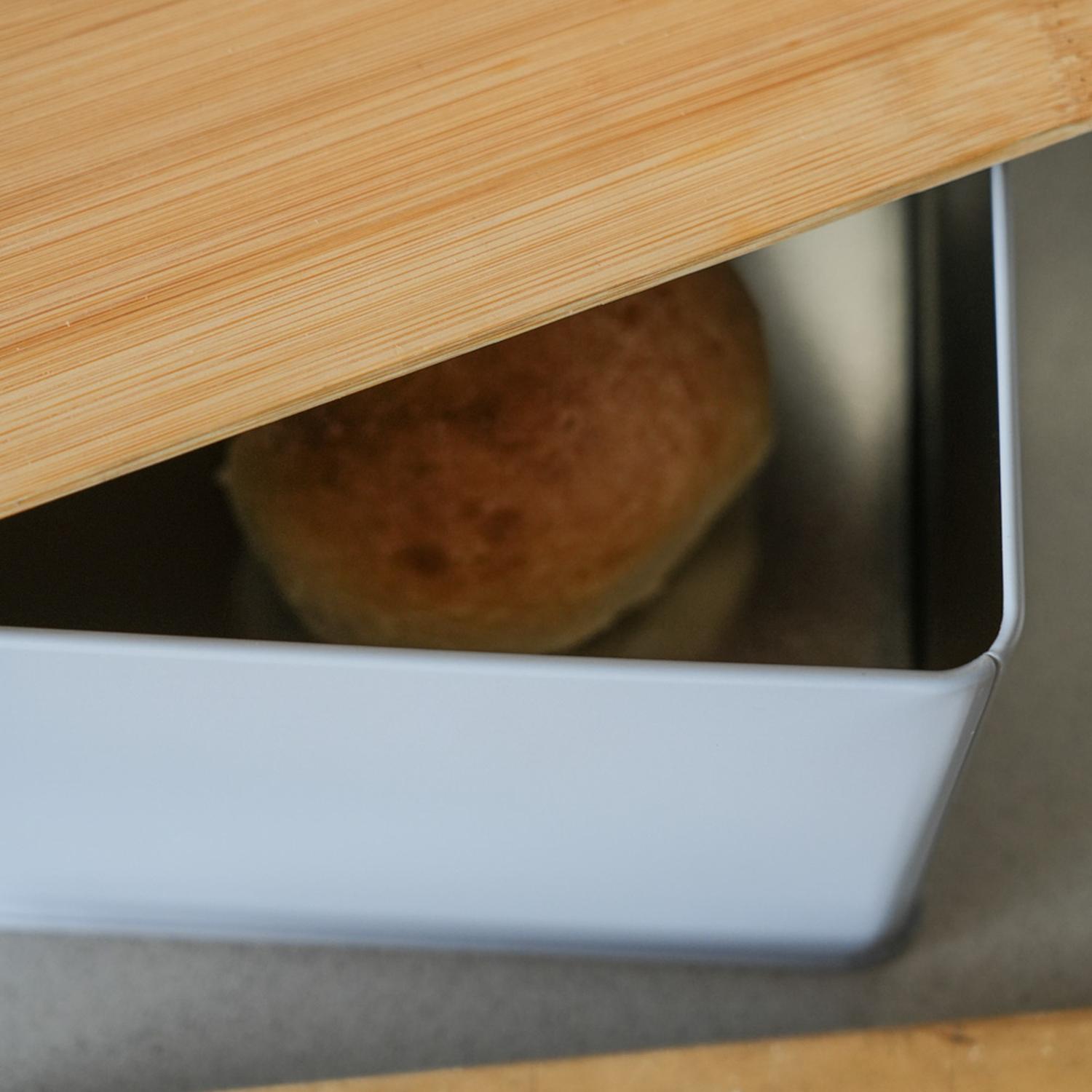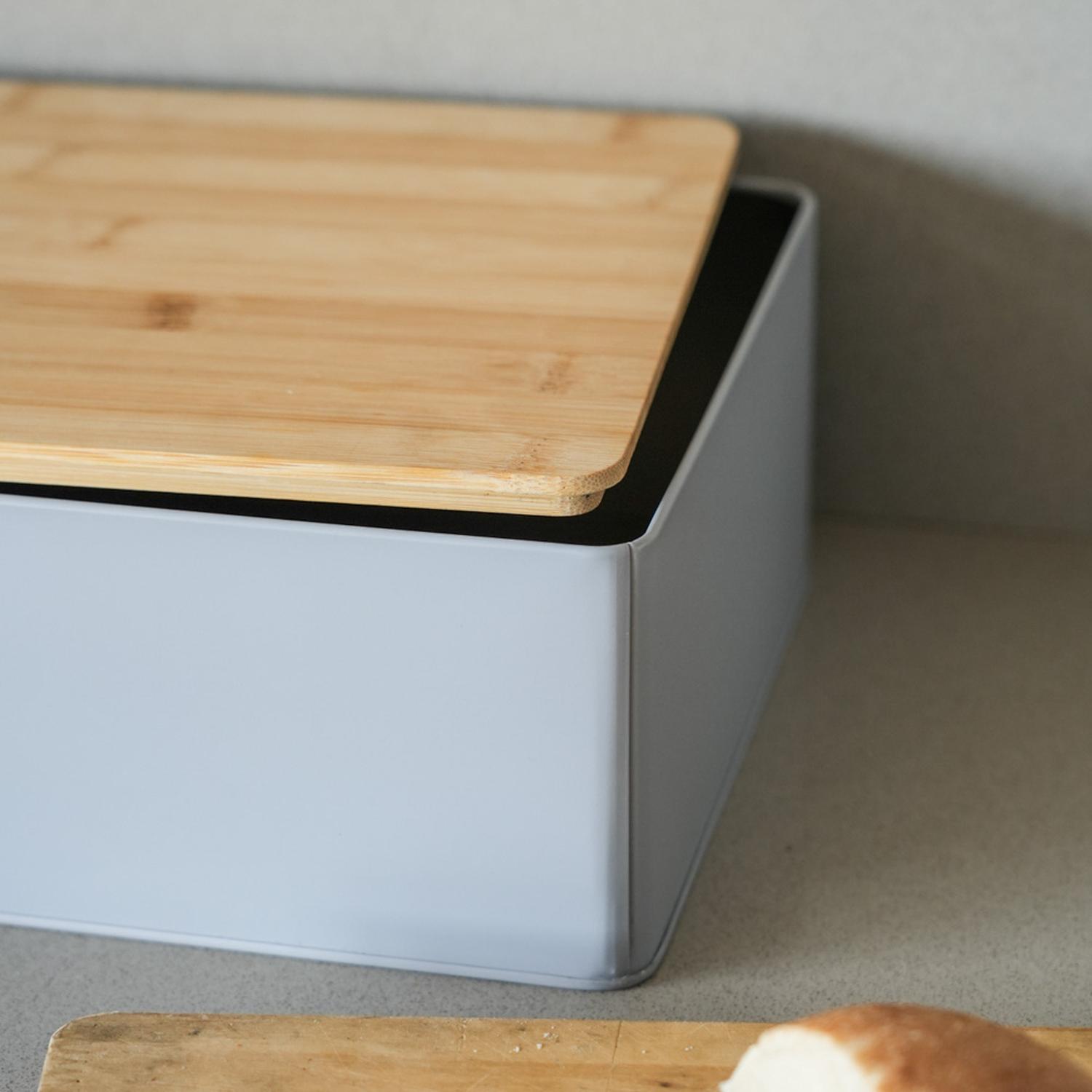 Nada como el aroma del pan fresco en la cocina, y qué mejor manera de conservarlo que en esta panera metálica de diseño elegante y funcional. Su acabado en gris claro le da un toque moderno, mientras que su tapa de bambú aporta calidez y naturalidad. Pero no es solo estética, sino también ingenio: la tapa se transforma en una tabla de cortar, permitiéndote rebanar el pan cómodamente sin necesidad de buscar otro accesorio.