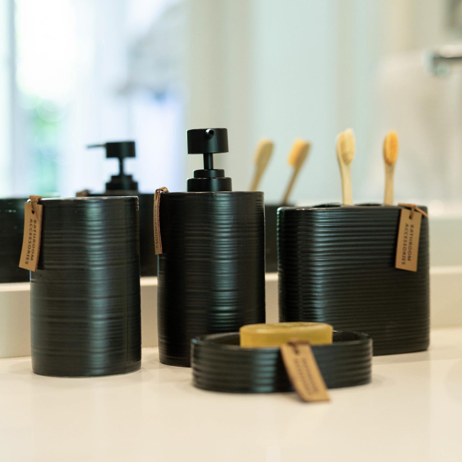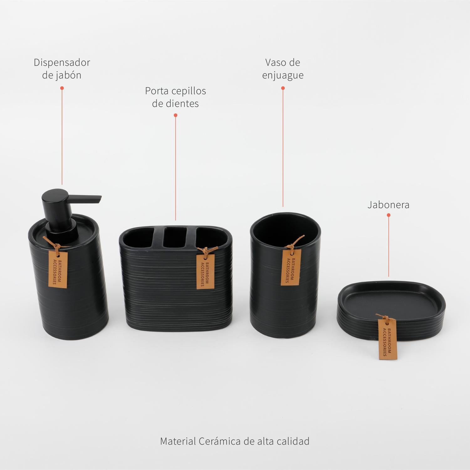 • Incluye: Dispensador de jabón líquido, vaso, vaso para cepillos y jabonera