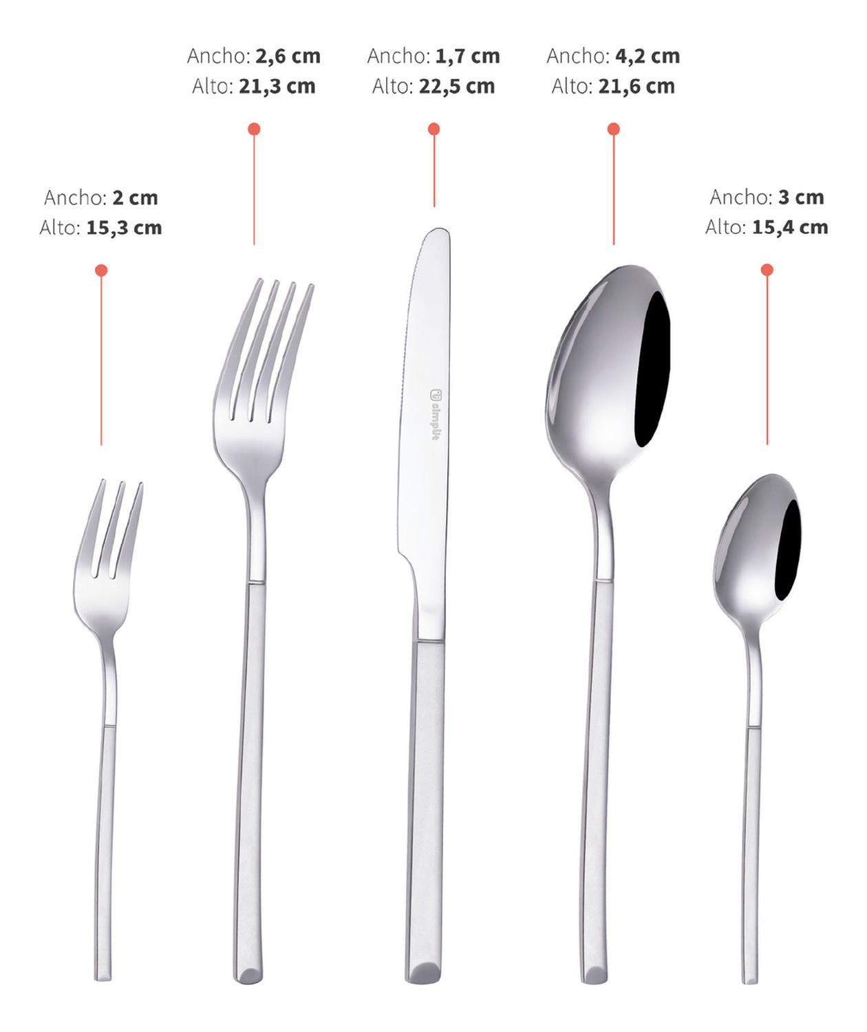 • 6 Cucharas grandes (Largo: 21,6 cm, Peso: 43 g, Espesor: 2,4 mm).