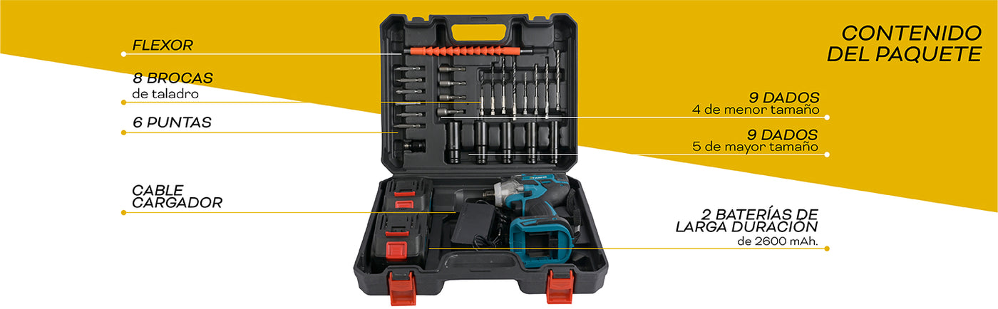 • Voltaje de Batería de 21V: Garantiza potencia constante y rendimiento prolongado.