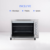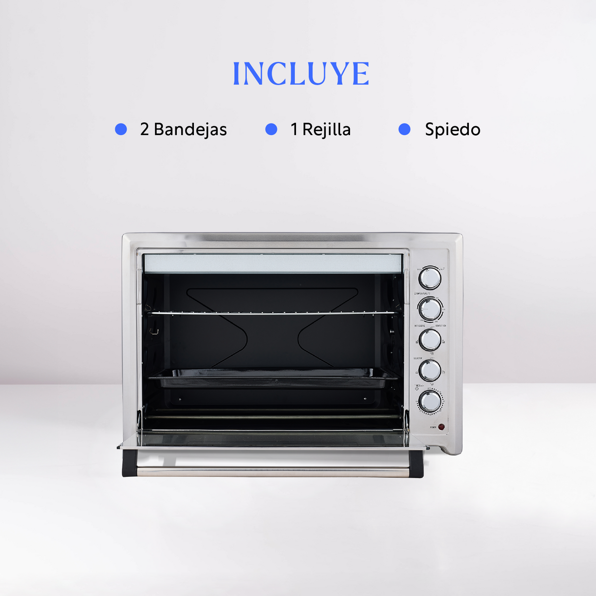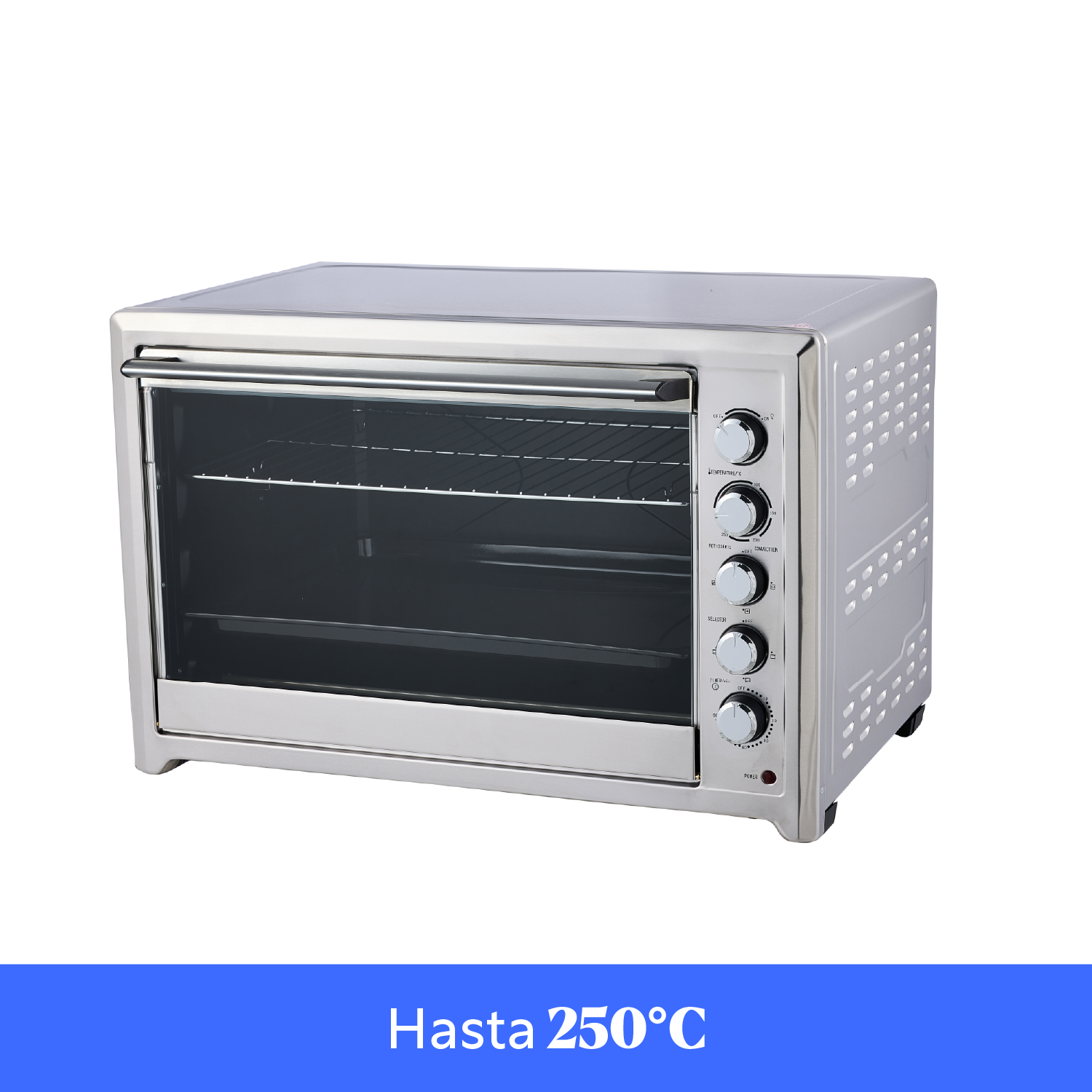 Oven Master 100 L es el horno eléctrico con mayor capacidad de EasyWays ya que, como dice su nombre, cuenta con 100 litros de capacidad. Su tamaño será perfecto para grandes familias o para negocios que necesiten preparar grandes cantidades de comidas horneadas.El interior de Oven Master 100 L está recubierto con material antiadherente por lo que su limpieza será un mero trámite. Por otro lado, su exterior es de acero inoxidable lo que te permitirá cocinar de manera segura.El horno eléctrico Oven Master 100 L cuenta con múltiples accesorios: Rejilla para Hornear, 2 Bandejas para Hornear, Asa para retirar la Bandeja y la Rejilla, Espiedo y Herramienta de Recuperación para el Espiedo.Exclusiva Cocción por Convección: Este tipo de cocción permitirá la circulación de aire caliente gracias al ventilador de esta EasyWays. Así, el calor se distribuirá de manera uniforme por el interior del horno eléctrico lo que permitirá que la cocción sea rápida y pareja. Es perfecta para cocinar carnes jugosas, asar verduras y hornear masas.Además de esta función, su Perilla de Funciones incluye la cocción por horno tradicional. Junto con esto podrás cocinar con calentamiento superior, inferior y superior e inferior.Las temperaturas de Oven Master 100 L son de 100°C a 250°C. Además, el temporizador de este horno eléctrico es de hasta 60 minutos.Oven Master tiene un moderno color Silver y su potencia es de 2.800 W.