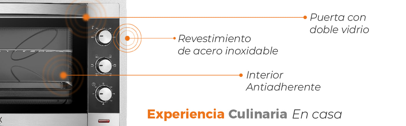 Su interior antiadherente hace que la limpieza sea rápida y sencilla, evitando que los residuos de comida se adhieran a las paredes del horno. El elegante revestimiento de acero inoxidable no solo añade un toque moderno a tu cocina, sino que también asegura una durabilidad excepcional.