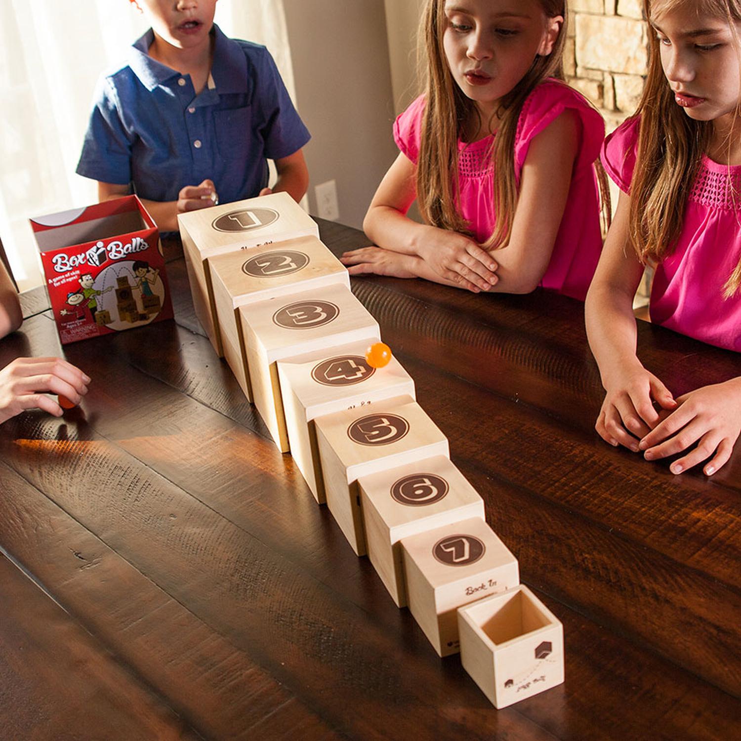 Cada caja está impresa con un juego sugerido para comenzar, o crea tus propias configuraciones de juego. Este conjunto de 8 cajas anidables de madera y 8 pelotas saltarinas viene con infinitas oportunidades para divertirse y desafiar. Arma un circuito y juega a que las pelotas reboten y caigan en determinadas cajas. La gran cantidad de opciones de juego atraen a todas las edades: desde niños pequeños que recién comienzan a probar su coordinación mano-ojo, hasta adultos. Juega solo, en parejas o incluso en grupos. Muévete y salta con Box N Balls.