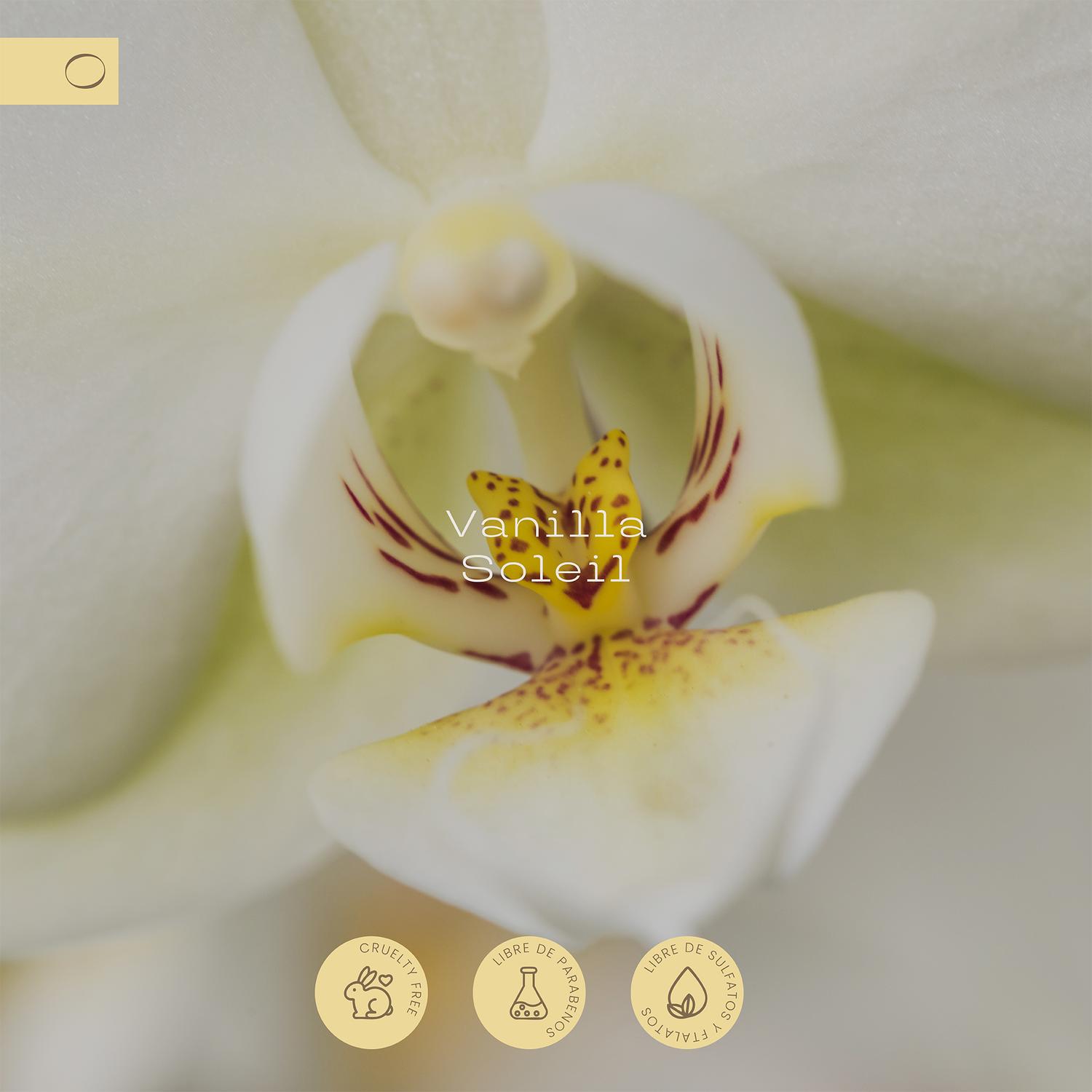 Vanilla Soleil; ilumina el ambiente con la suavidad de la vainilla, acompañada por matices herbales y un fondo amaderado de cedro. Es un aroma solar y veraniego, cálido y luminoso, que envuelve con frescura reconfortante, recordando la ligereza del sol sobre la piel.
