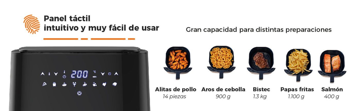 Su generosa capacidad de 5 litros te proporciona suficiente espacio para cocinar porciones grandes, ideal para familias o juntas con amigos. Ya sea que estés cocinando papas fritas crujientes, alitas de pollo jugosas o verduras asadas, esta freidora te ofrece resultados deliciosos en cada bocado.