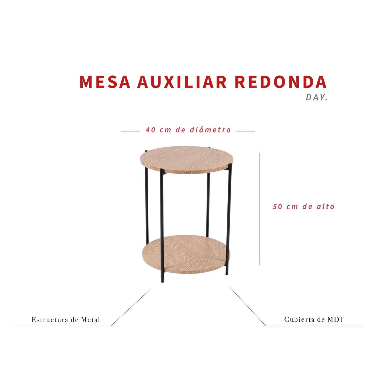 Transforma cualquier rincón de tu casa en un espacio lleno de estilo y funcionalidad. Esta mesa auxiliar redonda de la marca Day es la pieza que faltaba para darle un toque contemporáneo a tu living, sala de estar o dormitorio. Su diseño moderno, que combina la calidez del MDF con la firmeza del metal, se adapta a cualquier decoración, mientras que su doble repisa te ofrece el doble de posibilidades para organizar tus libros, poner una lámpara o simplemente apoyar tu taza de café.