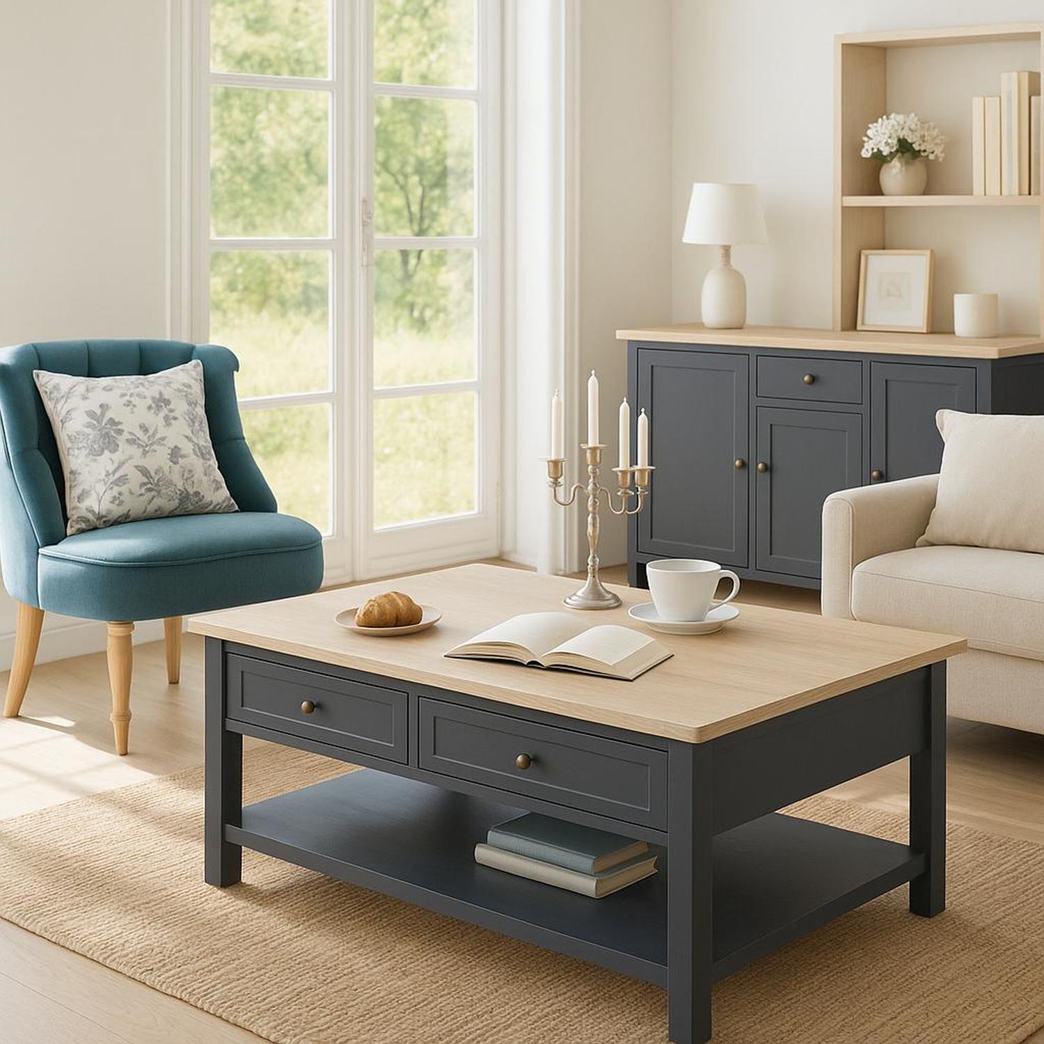 Dale a tu living un toque de elegancia y funcionalidad con la Mesa de Centro Damian. Su diseño clásico y colores neutros la convierten en el corazón de tu espacio, ideal para compartir un café, leer un libro o simplemente mantener la organización. Con sus cuatro cajones y amplia repisa inferior, el desorden ya no será un problema.