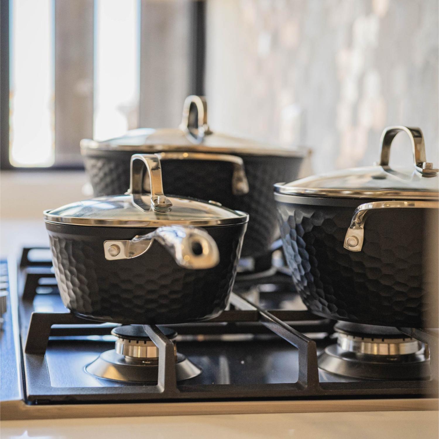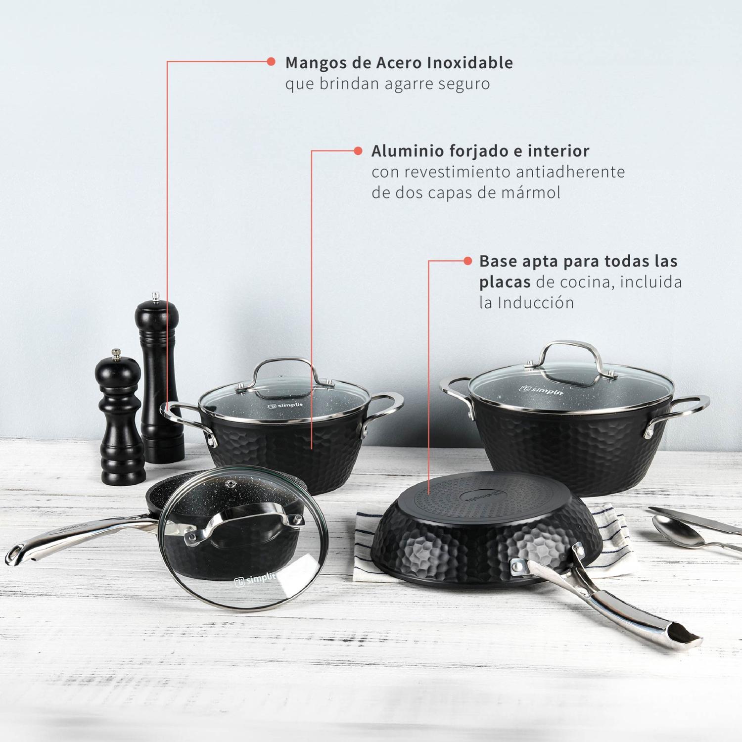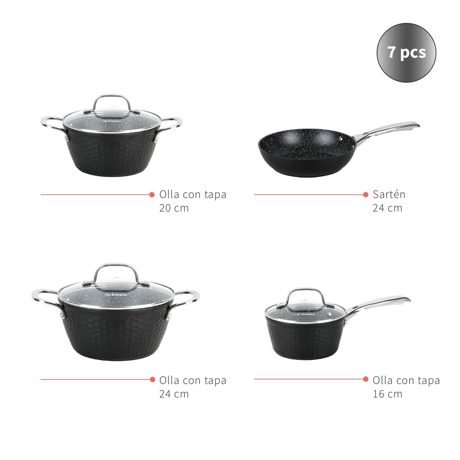 • Incluye: Olla de 24 cm con tapa, Olla de 20 cm con tapa, Olla de 16 cm con tapa, Sartén de 24 cm.