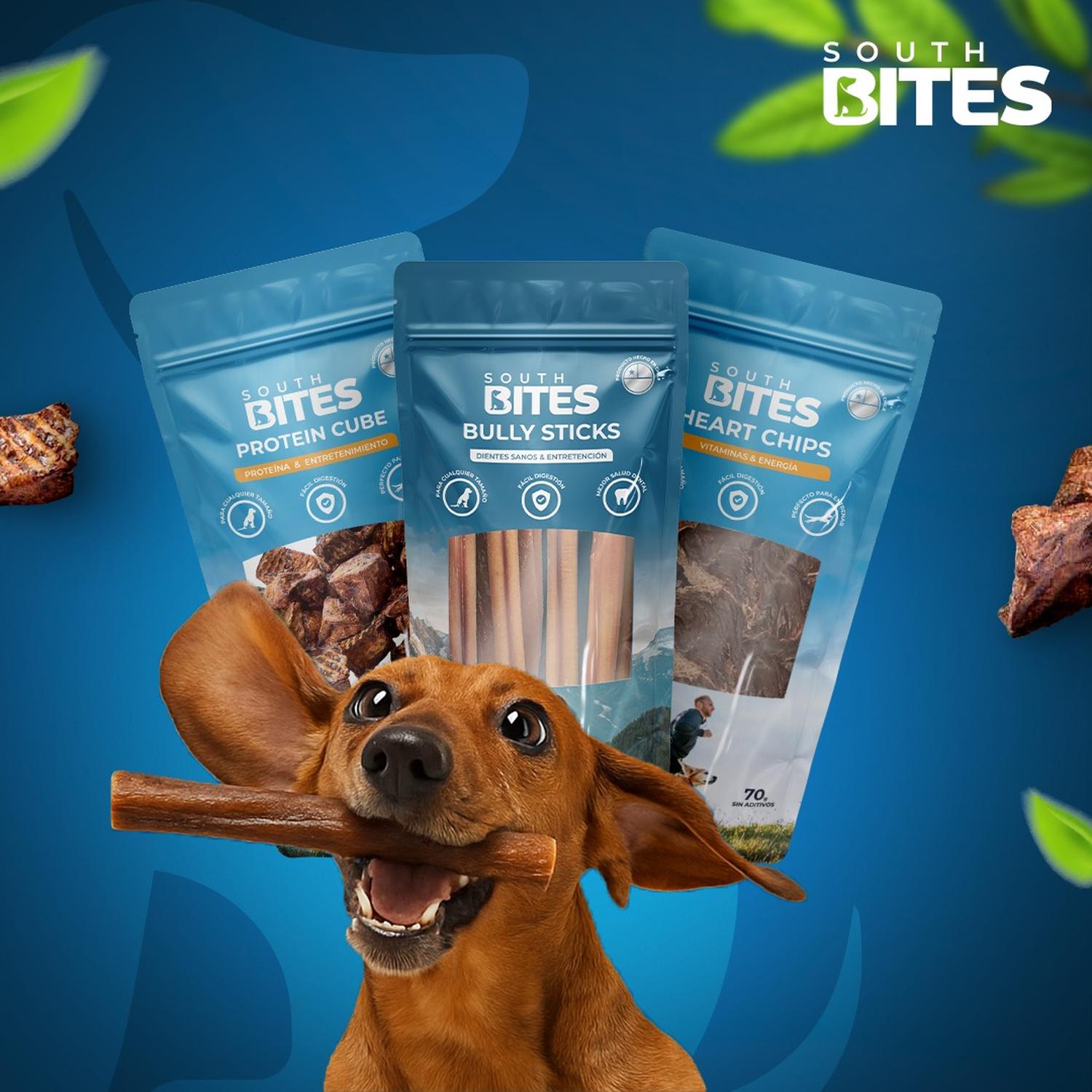 Descubre el equilibrio perfecto entre sabor, nutrición y diversión con el Pack Snack South Bites, que incluye 1 Bully Stick, 1 Protein Cube (chips de pulmón) y 1 Heart Chips.