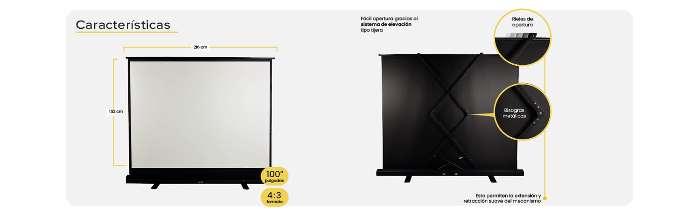 • Pantalla Grande: Con 100 pulgadas, este telón es el complemento perfecto para el proyector, creando una experiencia visual impresionante en cualquier ambiente.