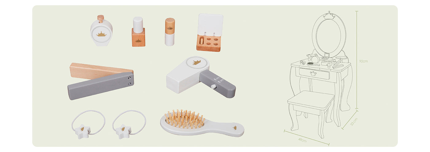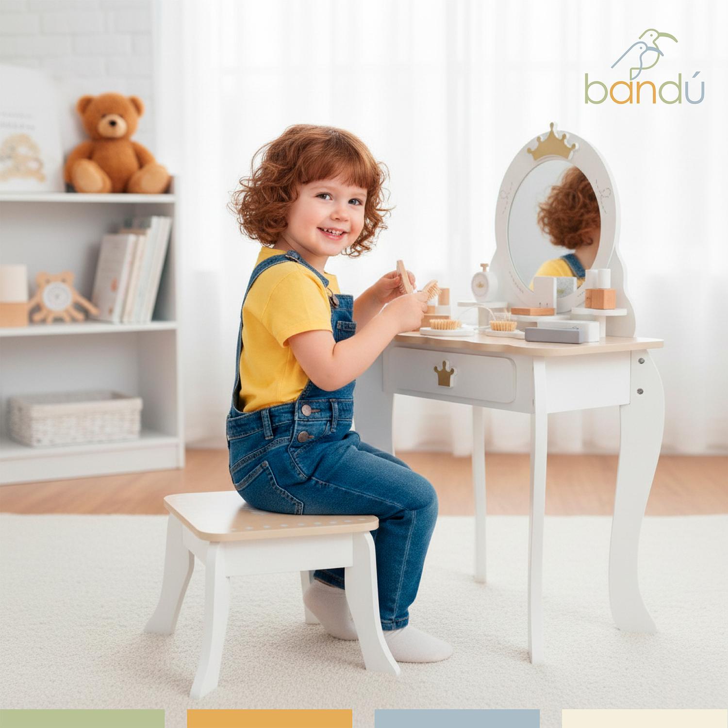 Con espejo, banquito y accesorios de maquillaje de madera, este set invita a