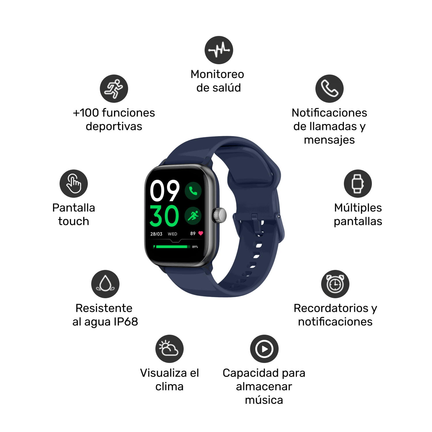 Vive cada día con la mejor tecnología en tu muñeca. El Smartwatch Blue Rhythm X10 ofrece un diseño compacto de 41 mm con pantalla táctil de 1.85”, resistencia al agua IP68 y una batería de hasta 7 días de duración.