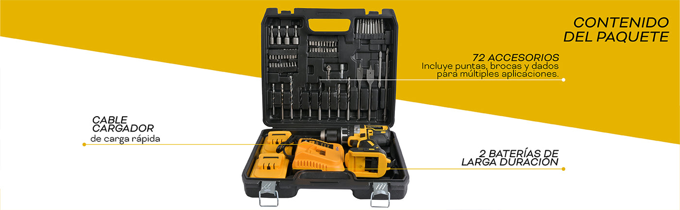 • Un completo kit de 72 accesorios, que incluye puntas, brocas y dados para múltiples aplicaciones.