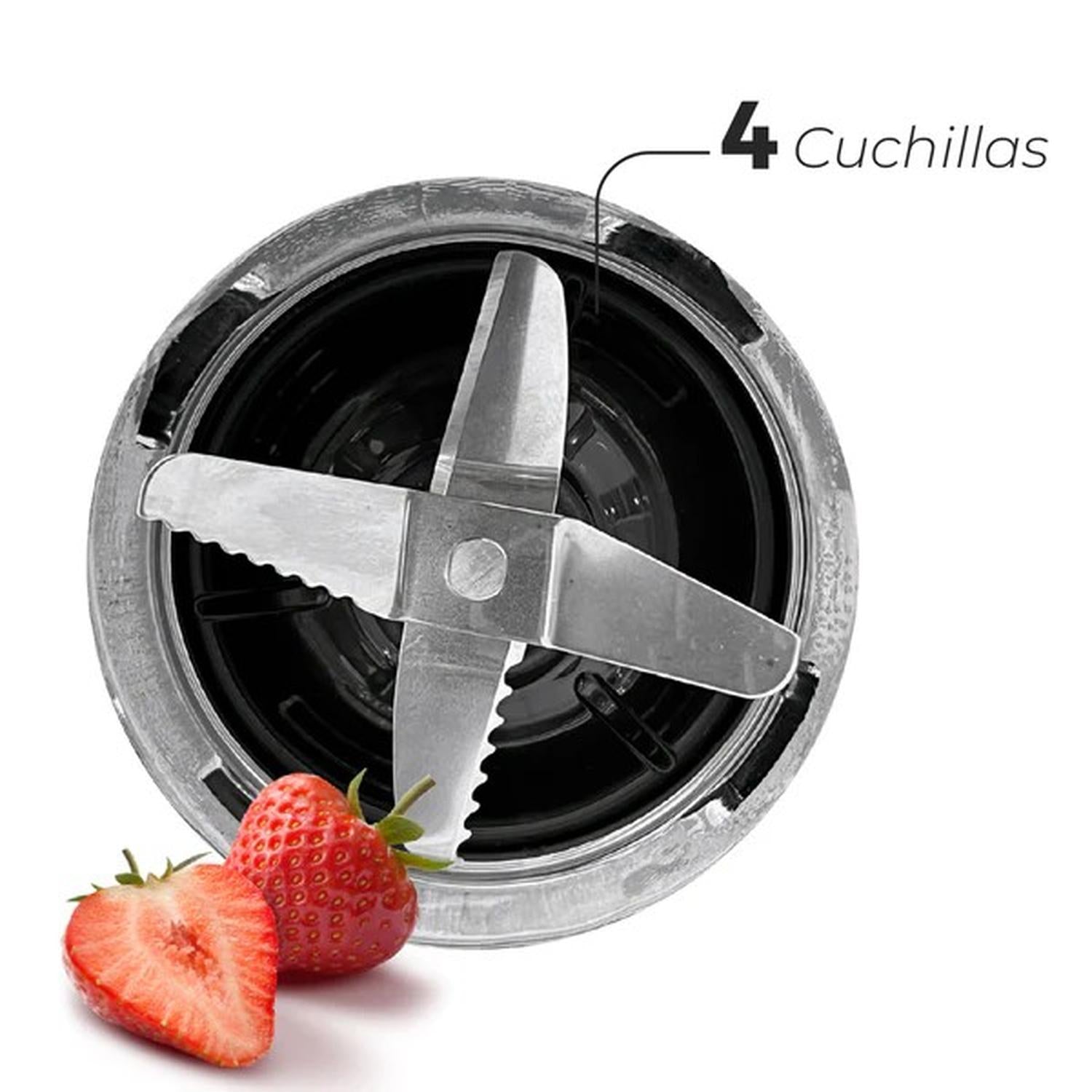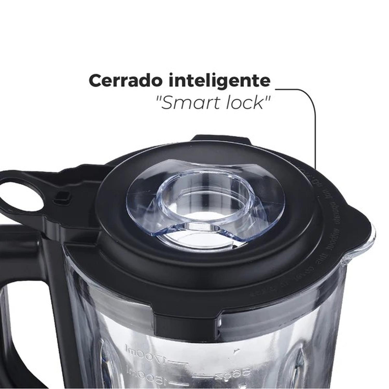 • La tecnología Smart Lock garantiza un cerrado seguro, evitando derrames y ofreciendo mayor tranquilidad durante el uso. Sus 4 cuchillas afiladas y resistentes están diseñadas para triturar de manera uniforme, incluso los ingredientes más duros.
