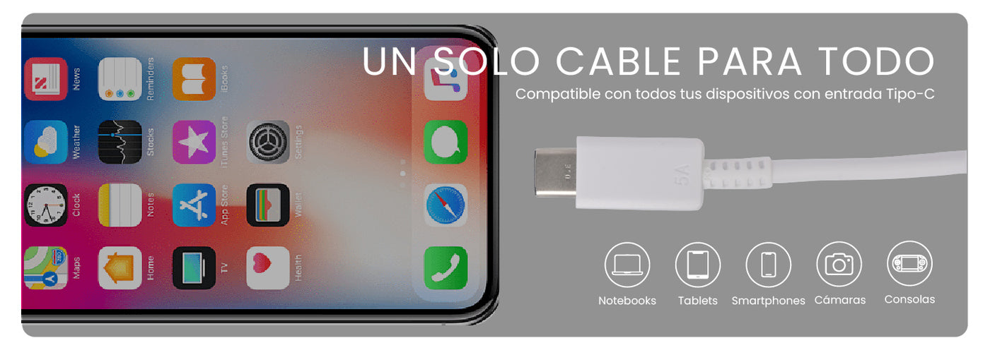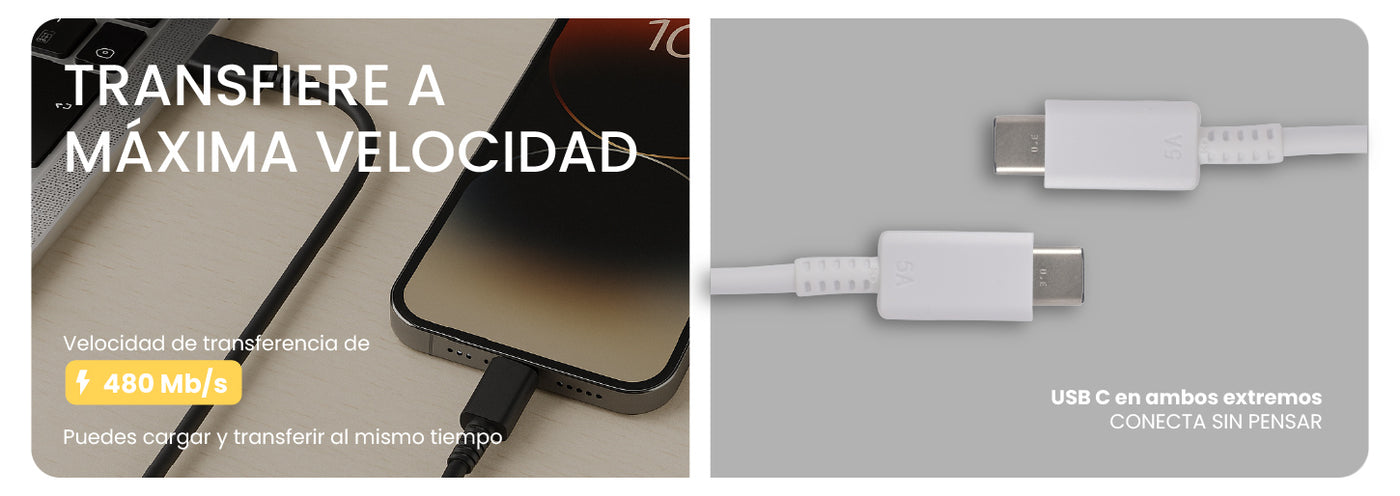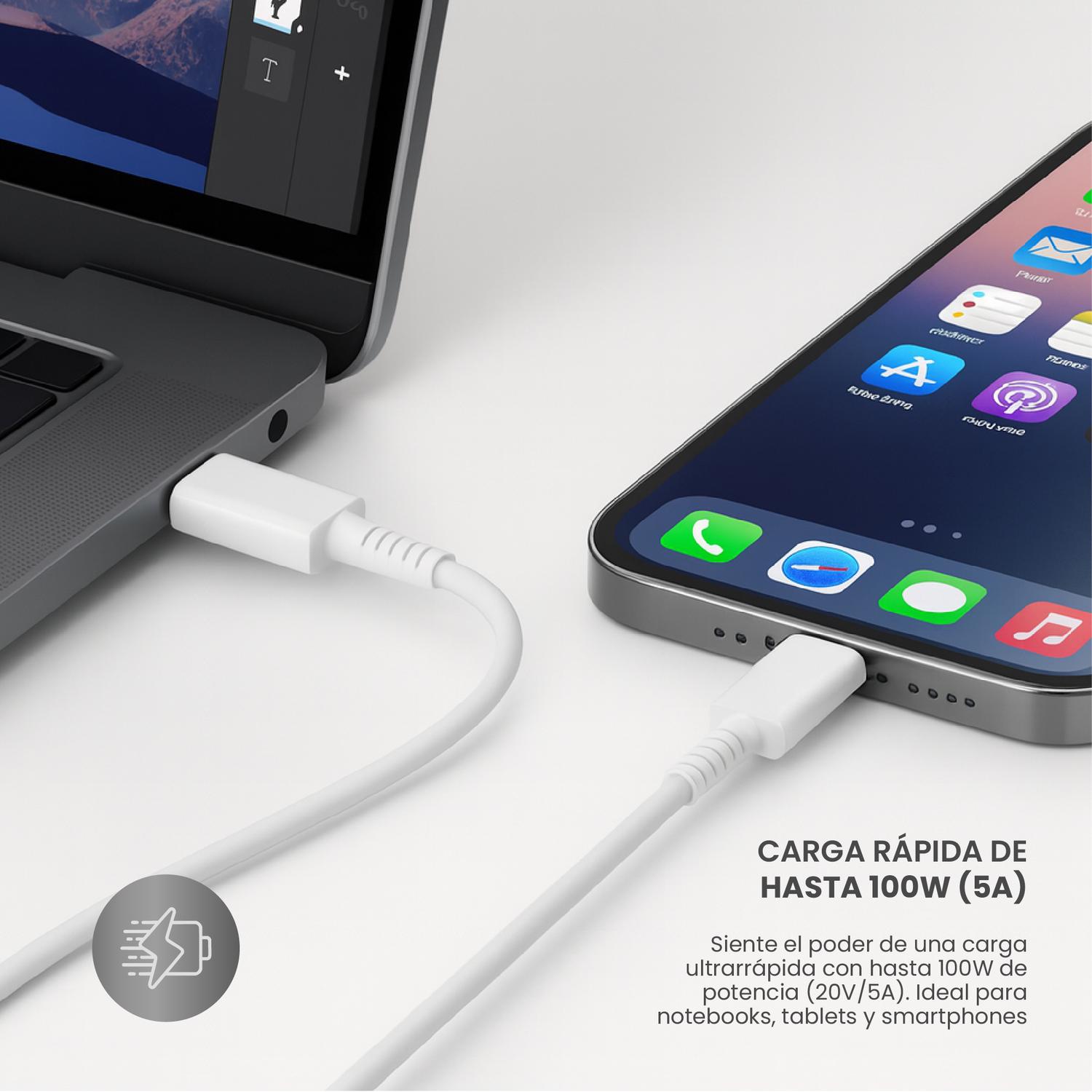 Potencia máxima y velocidad imparable. Sus 100W (5A) aseguran que incluso tus dispositivos más exigentes se carguen en tiempo récord. Con 1 metro de longitud y un acabado elegante en blanco, combina estilo, comodidad y resistencia para acompañarte en cada momento de tu día.