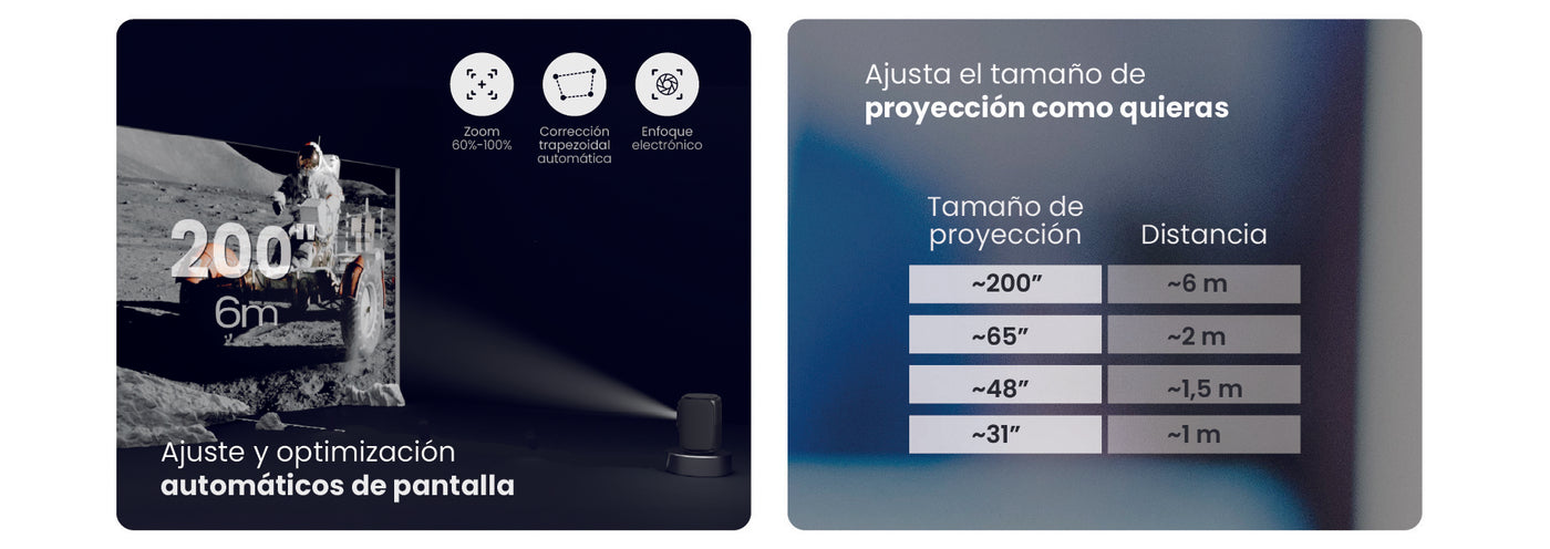 •    Pantalla adaptable: Proyección de 25” a 160” con una distancia de 0.8m a 4.9m. Relación de tiro 1.36:1 para instalación versátil.