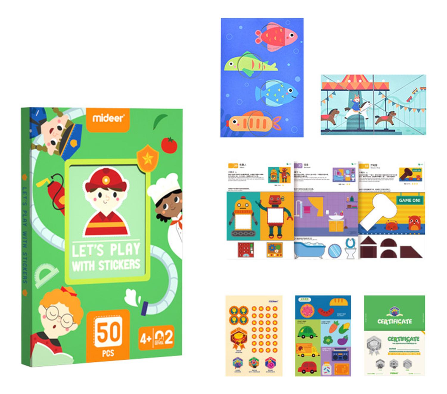 Juguemos con stickers nivel 2, incluye 50 ejercicios más difíciles para jugar con pegatinas y pegamento, lo que anima a los jugadores de nivel intermedio a desarrollar aún más su habilidad práctica. Este nivel ayuda a desarrollar la coordinación de las manos y el cerebro, perfeccionar las habilidades motoras finas y mejorar las habilidades de corte y pegado. Edad Recomendada +4 Años