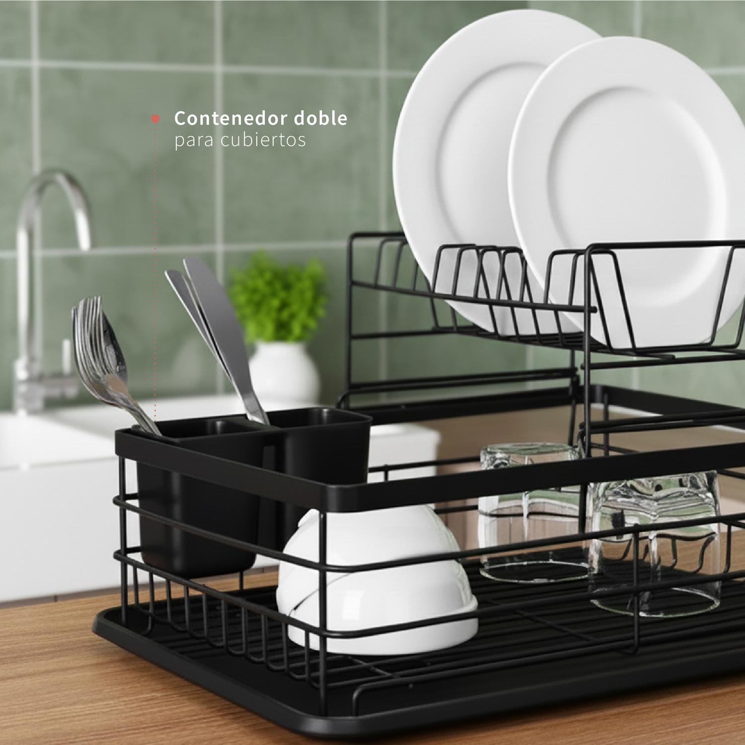 Cuenta con una bandeja inferior de drenaje y un contenedor doble para separar tus cubiertos.