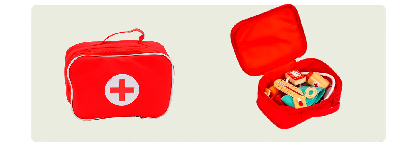 madera: estetoscopio, jeringa, termómetro, frascos, vendas, pastillas,