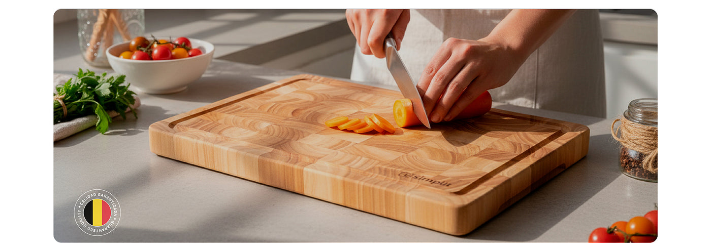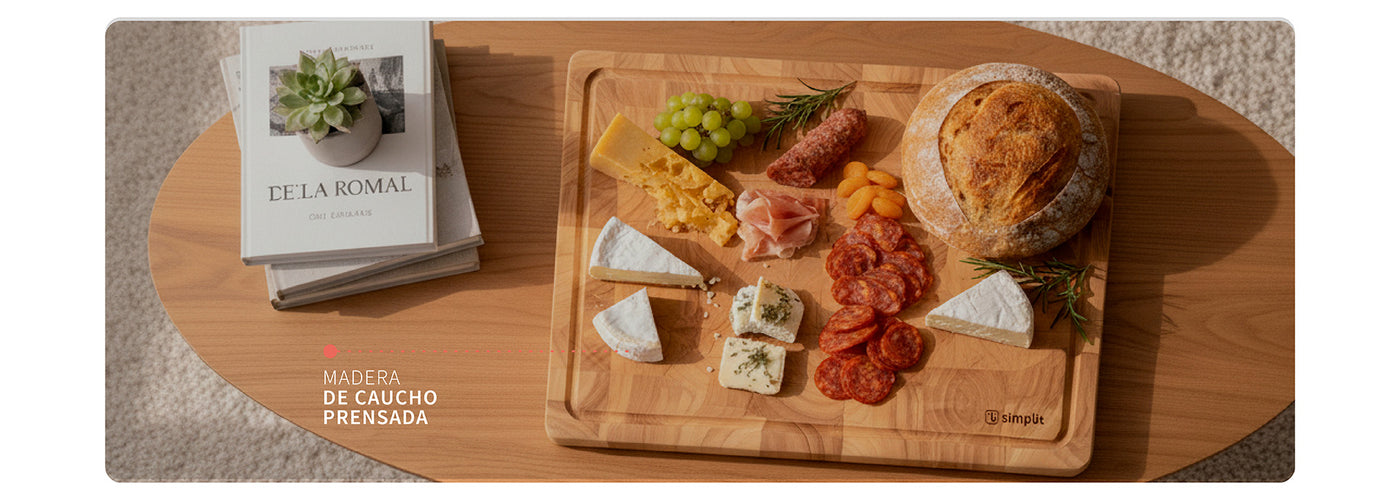 Transforma cada preparación en un momento especial con la Tabla Para Picar Cortar Madera Cutte Simplit. Más que un simple utensilio, es una pieza central que combina la funcionalidad superior con la calidez atemporal de la madera de caucho. Su robusta construcción en madera de caucho prensado de veta visible no solo ofrece una superficie de corte duradera y gentil con tus cuchillos, sino que su belleza te invita a llevarla directamente a la mesa. Utilízala para cortar carnes, verduras y frutas, o deslúmbrate al usarla como elegante tabla para aperitivos y presentaciones. Un diseño esencial para quienes valoran la calidad y la estética en la cocina.