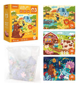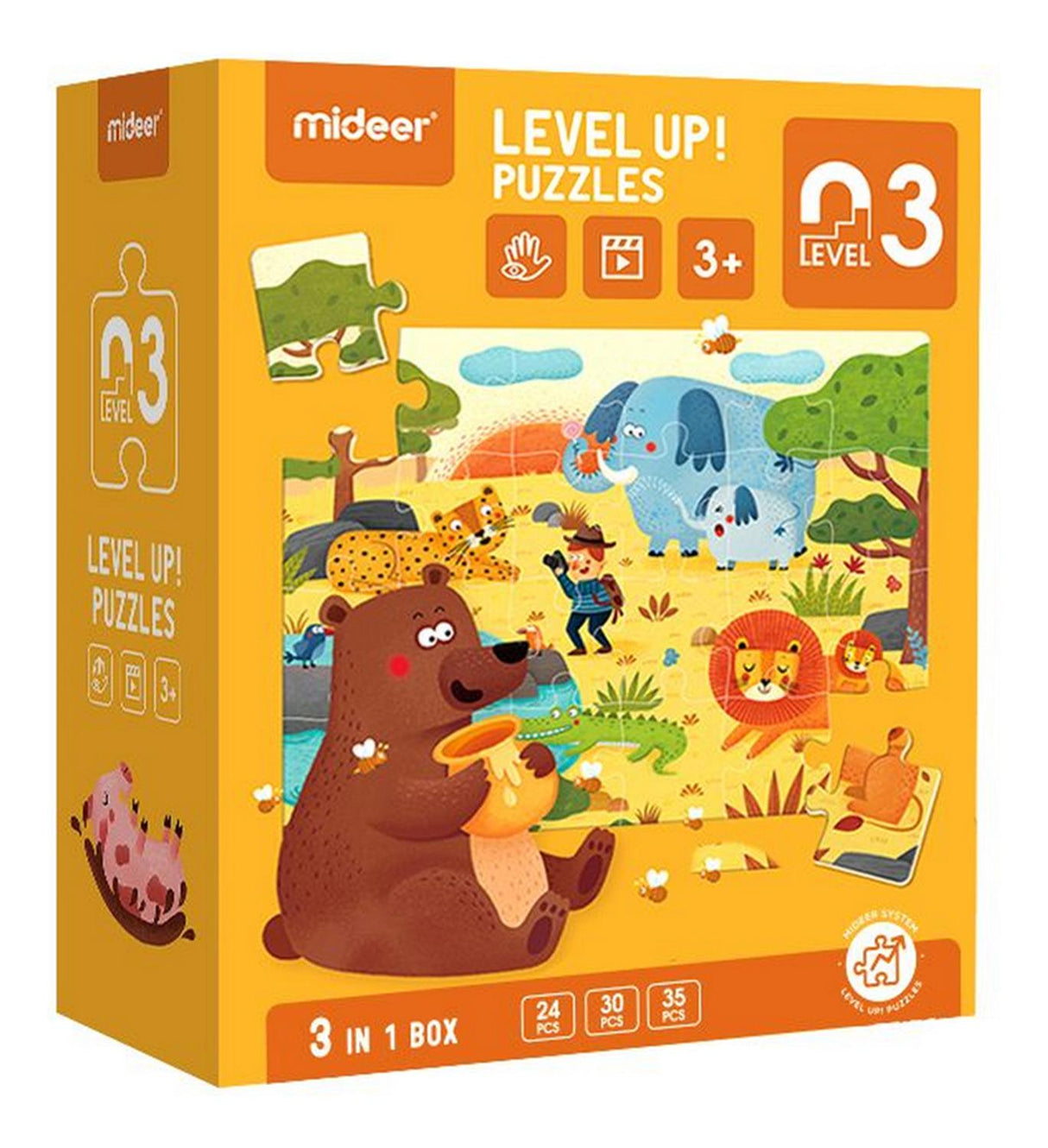 - Nivel 3 Incluye 3 puzzles de diferentes hábitats naturales: savanna 24 pcs, granja 30pcs y bosque 35pcs.