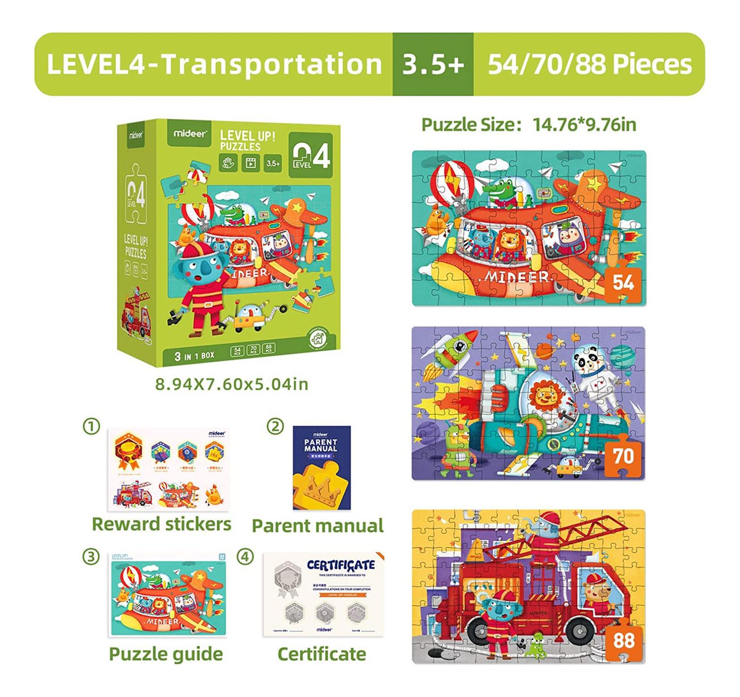 - Nivel 4 Incluye 3 puzzles de vehículos, aviones 54pcs, cohete 70pcs, bombero 88pcs.