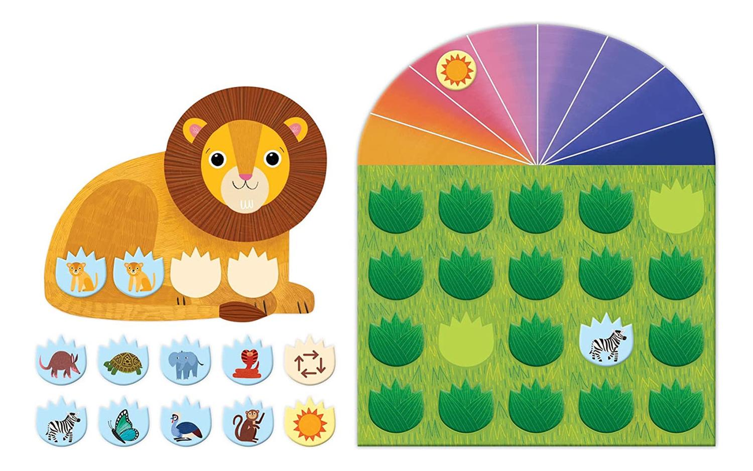 Safari de Leones es un juego cooperativo de Mudpuppy es un juego nuevo y divertido que crea una comunidad, fomenta el respeto y apoya el desarrollo socioemocional. Los jugadores trabajan juntos para voltear e intercambiar fichas, recordando lo que hay debajo, pero ten cuidado de no revelar la ficha del sol y la noche comenzará a caer. ¡Encuentra todos los cachorros antes de que se ponga el sol y todos triunfan!