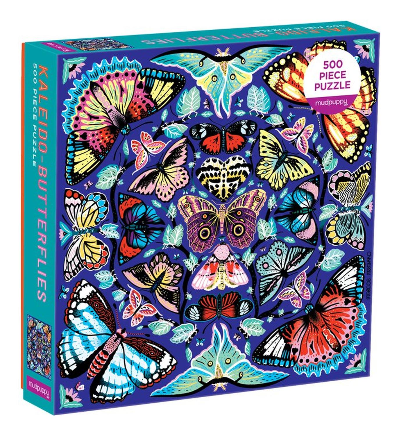El rompecabezas familiar de 500 piezas mariposas presenta una ilustración de coloridas mariposas dispuestas en un patrón inspirado en la deslumbrante vista a través de un caleidoscopio.