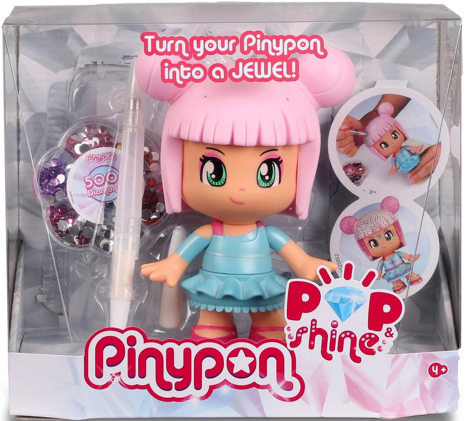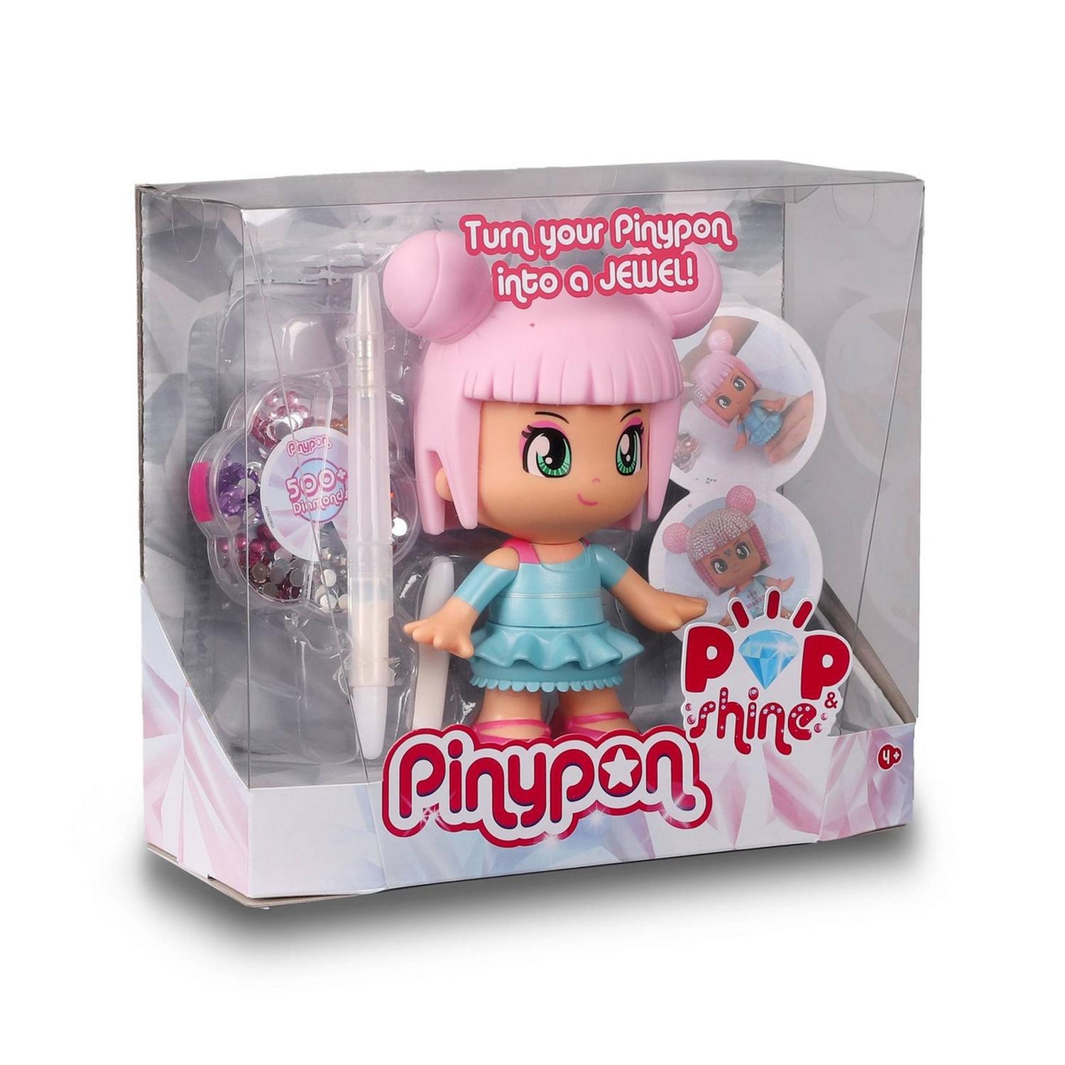 Pinypon Pop & Shine es una nueva muñeca la cual es una figura de 17 cm que se puede personalizar y hacer brillar completamente a tu gusto. La muñeca tiene el pelo rosa con moñitos, camiseta y falda azul, e incluye una amplia variedad de accesorios para que la puedas decorar a tu gusto, como cristales de 7 colores diferentes, pegatinas, gafas, zapatos y más. Los cristales son la parte más especial de la muñeca, esto debido a que pueden colocarlos en el pelo, la ropa, los zapatos o cualquier otra parte de la muñeca. Pinypon Pop & Shine es un juguete perfecto, creativo y divertido que permite a las niñas desarrollar su imaginación, su sentido del estilo y sus habilidades motrices finas. Promoviendo el juego de rol, su imaginación, su creatividad y sus habilidades sociales. Siendo este una excelente opción de regalo ya que les proporcionará un juego divertido y creativo, ofreciendo horas de diversión y juego.