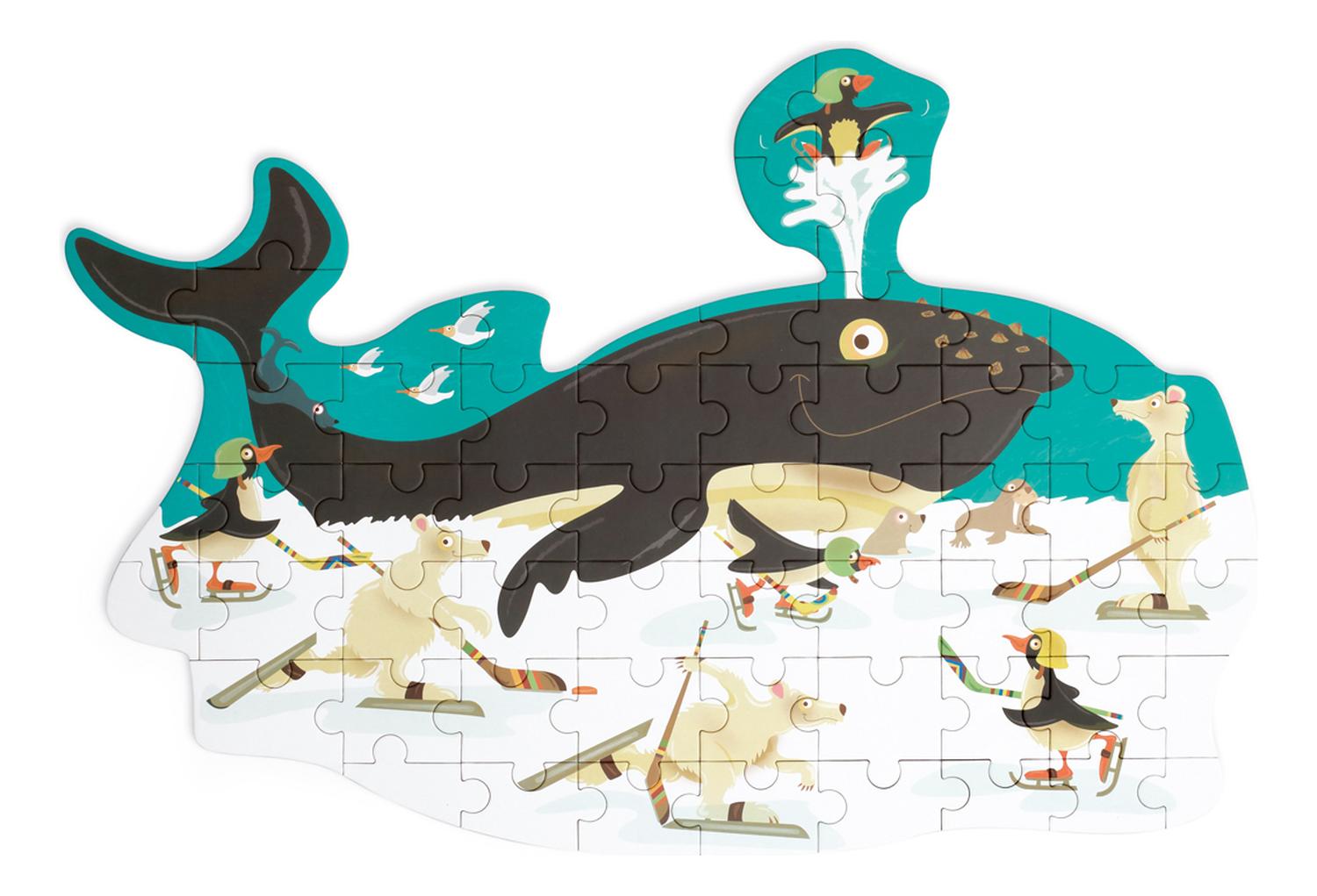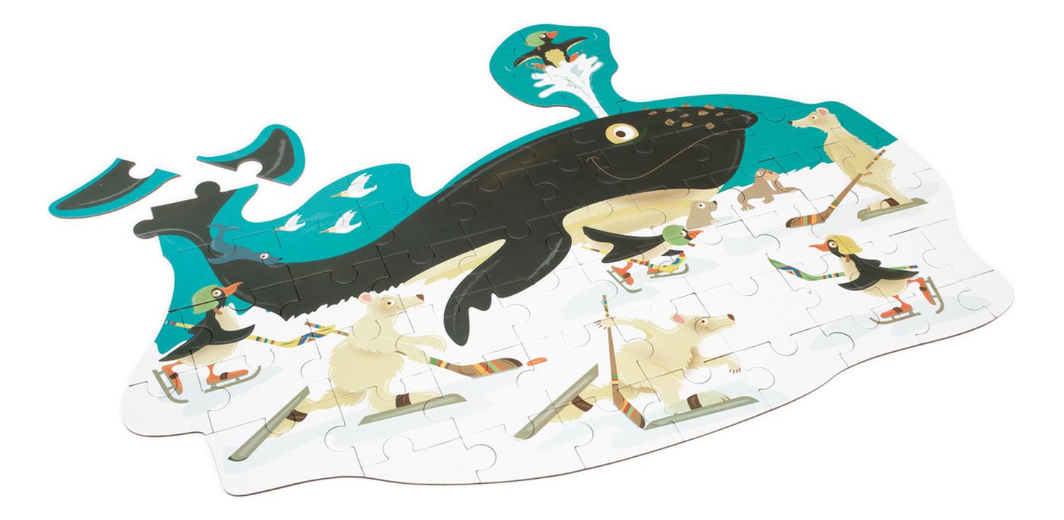 Entretenido puzzle con forma de ballena de 60 piezas, donde podrás observar diferentes animales divirtiéndose sobre el hielo. Hecho en cartón reciclado e impreso con tintas en base a soja.