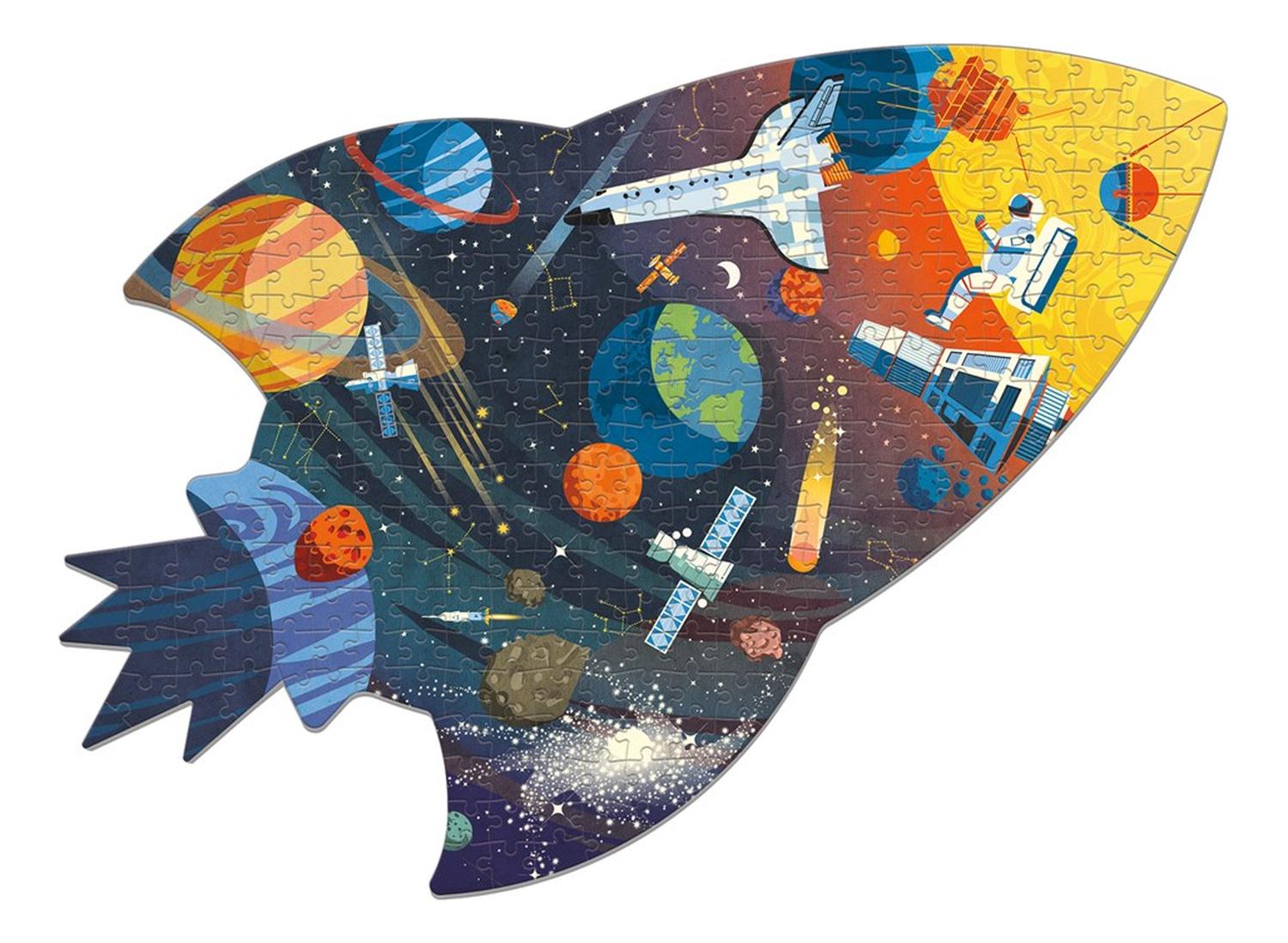 Puzzle de 300 piezas con un colorido collage de planetas, naves espaciales, satélites y más. El rompecabezas terminado tiene forma de nave espacial, lo que genera un factor sorpresa cuando se completa.