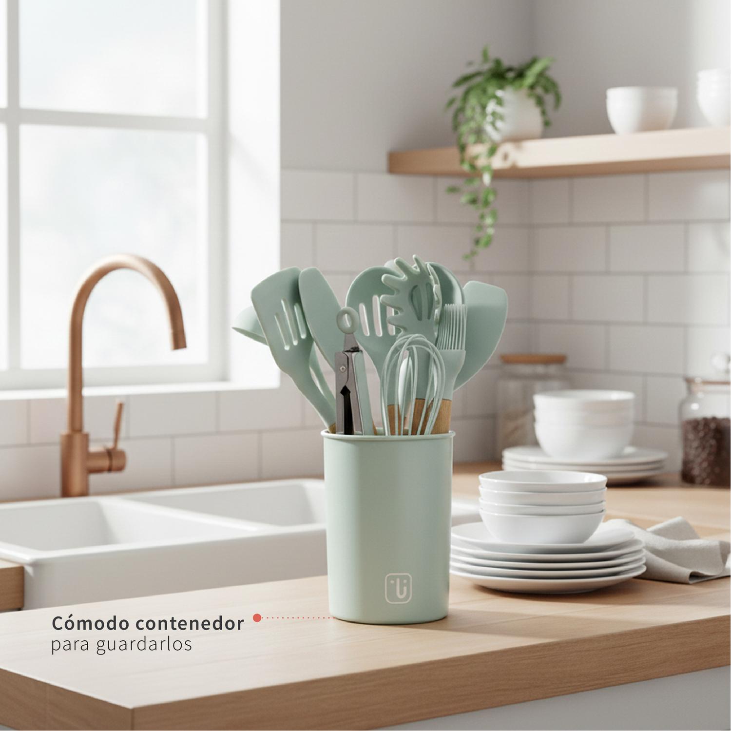 Nuestro Set de Utensilios de Cocina Simplit incluye 12 piezas básicas para equipar de la mejor manera tu cocina y darle vida y onda a tu espacio favorito. Este set viene con un cómodo contenedor para que los guardes. Todos los utensilios cuentan con un mango de madera y silicona fácil de limpiar que no absorbe olores ni sabores de los alimentos. Resisten temperaturas hasta los 230ºC.