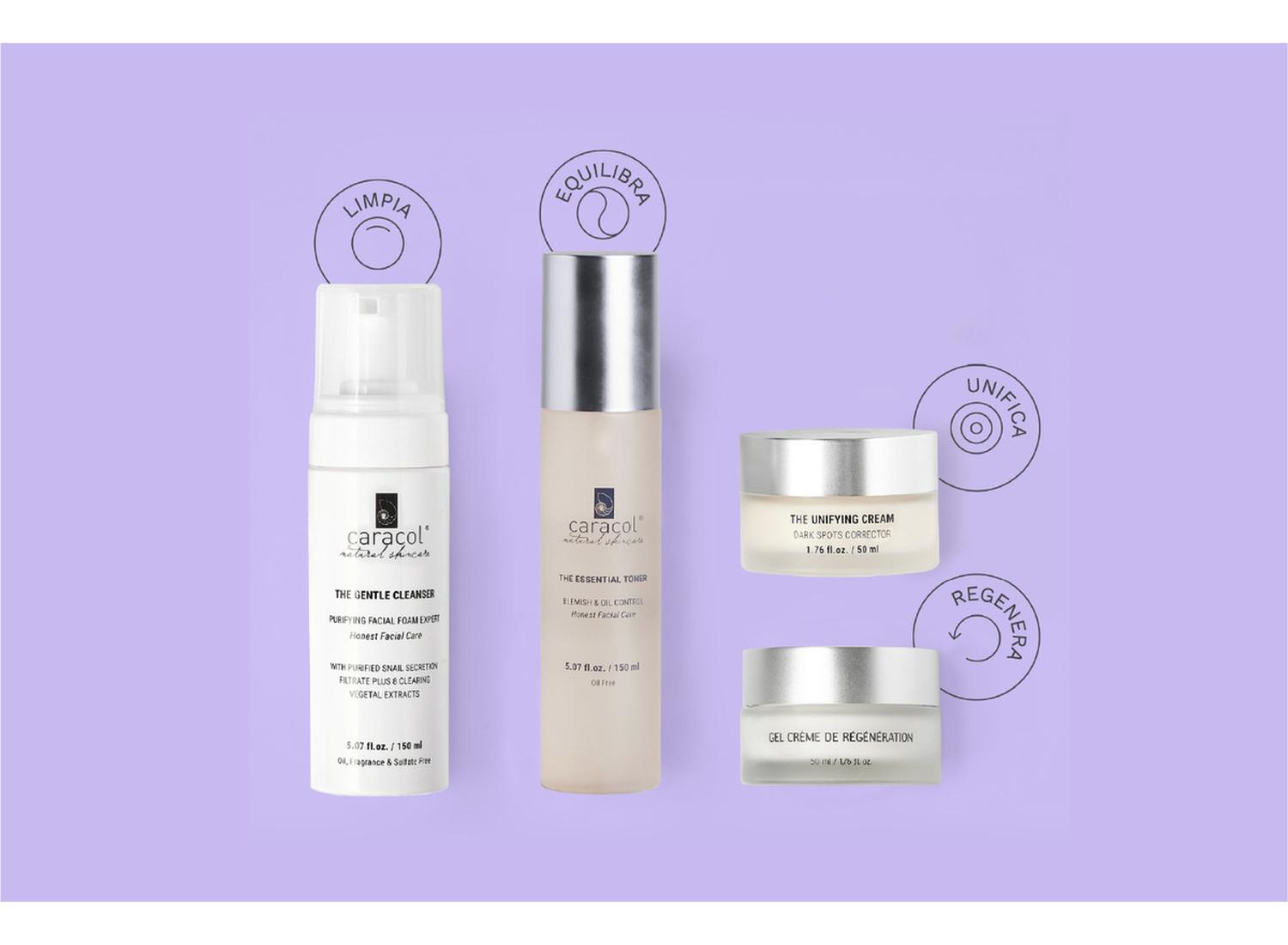 Pack para combatir acné y reducir manchas. Este pack ofrece; Limpieza con nuestro suave mousse que limpia sin intervenir nuestra barrera de piel natural. Tonificar + hidratar con nuestro tónico calmante, neutralizar el ph y preparar para una mejor absorción del resto de los pasos. Y para sellar la hidratación te recomendamos utilizar la crema gel de regeneración en la mañana. Regenera, hidrata, equilibra la grasitud, combate granos y espinillas, cierra los poros y logra un peeling suave. Y En la noche, te recomendamos usar the unifying gel cream. Aclara y reduce manchas del rostro, cuello, escote y manos. Unifica el tono de la piel, ayuda a reducir manchas de sol, acné pigmentadas, embarazo y hormonales.