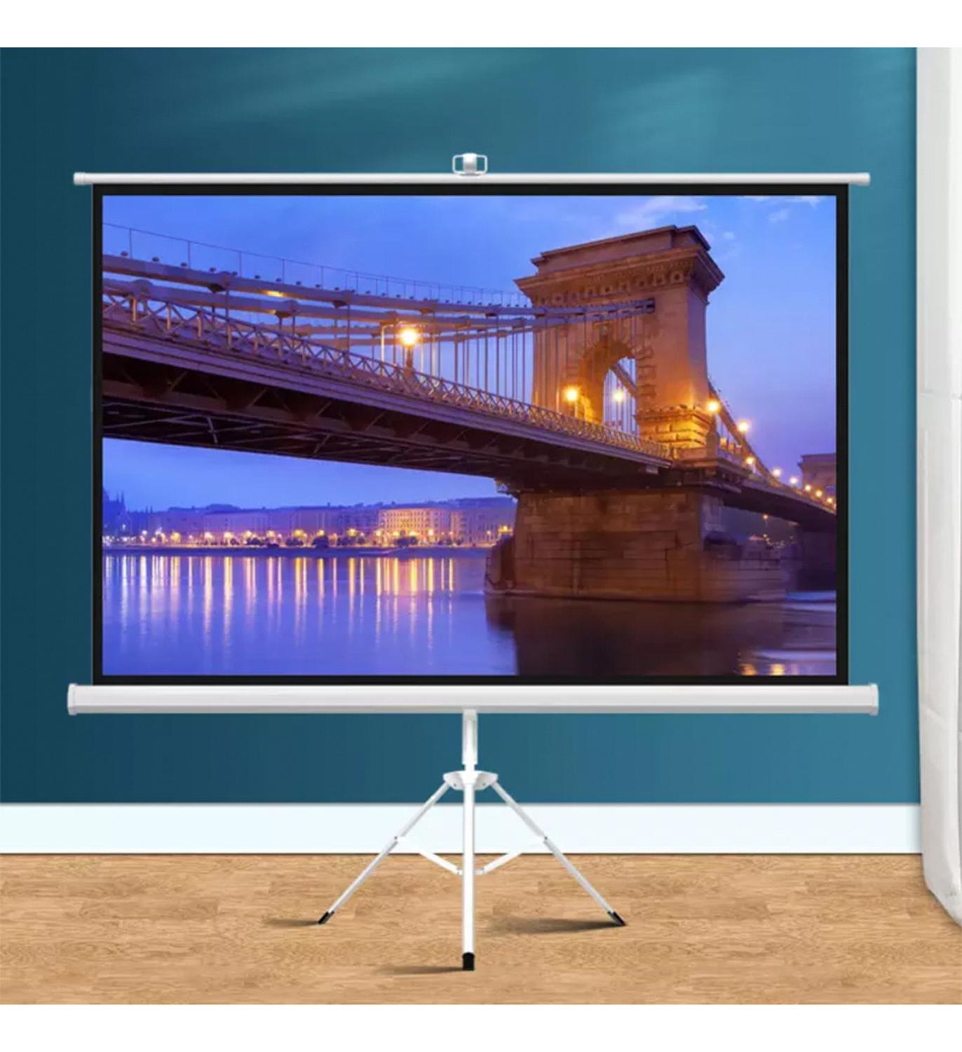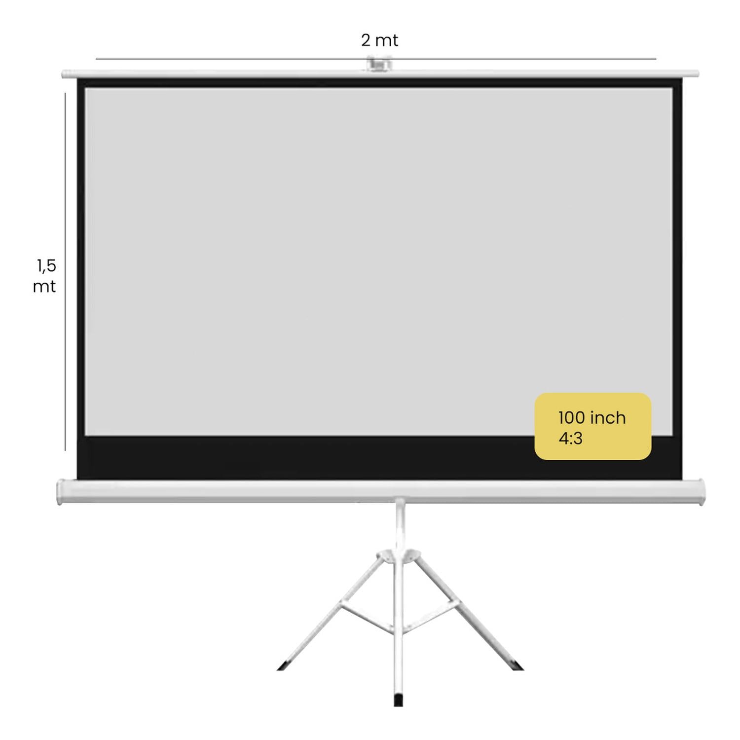 Para una visualización épica, el telón manual de 100 pulgadas es el compañero ideal. Su tela de PVC y fibra de vidrio de alta resistencia evita las arrugas, mientras que los bordes negros optimizan el enfoque. Es de fácil y rápida instalación, y su trípode retráctil lo hace transportable y perfecto para llevar a cualquier lugar.